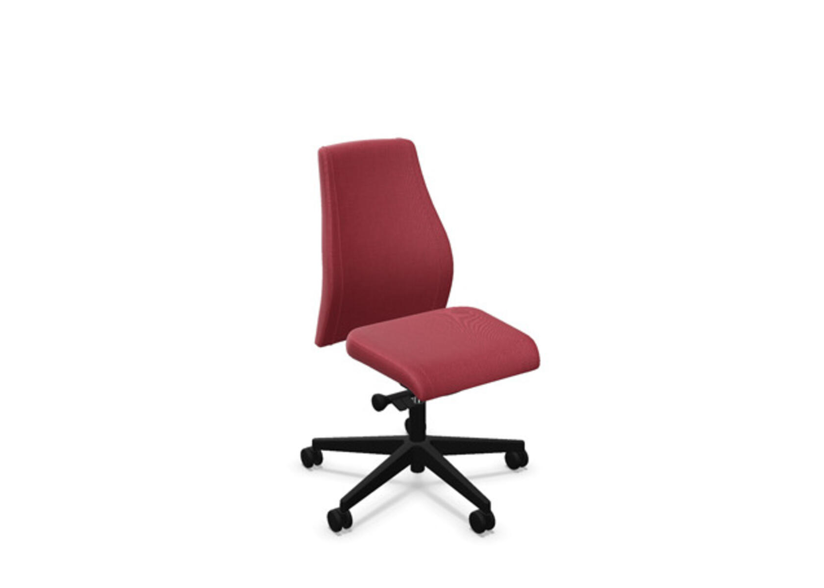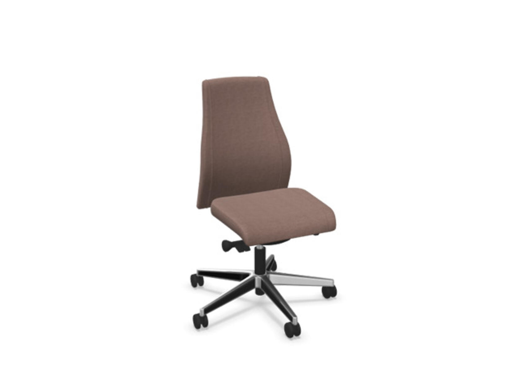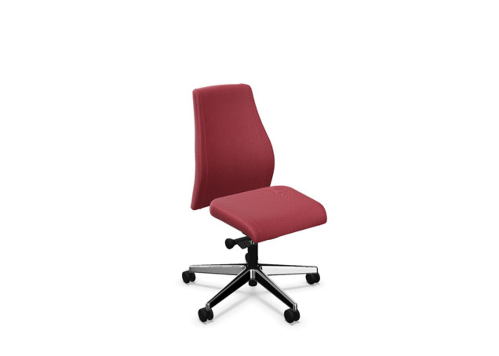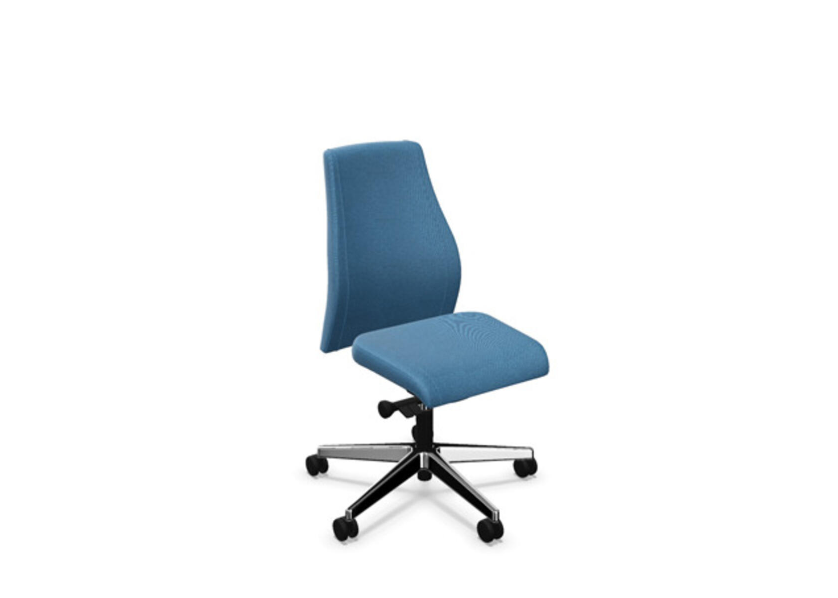 En stilren og ergonomisk kontorstol med fuldpolstret høj ryg og synkronmekanisme, designet til at give støtte ved aktiv siddestilling gennem hele arbejdsdagen. Polstret i slidstærkt polyesterstof. Den synkroniserede bevægelse mellem ryg og sæde giver en aktiv og behagelig siddestilling; ryglænet har en hældning på 20° synkroniseret med sædets 11°. Ryglænet kan låses i 5 positioner, og modstanden kan justeres via et drejehåndtag. Ryglænet kan højdejusteres 70 mm med 13 låsepositioner. Stolen har Anti-Shock-funktion, som forhindrer ryglænet i at slå frem, når låsen frigives. Vælg mellem kryds i sort polyamid eller poleret aluminium samt selvbremsende hjul til både hårde og bløde gulve. Som tilvalg kan der vælges lændestøtte, manuelt justerbar i dybden (20 mm) via et drejehåndtag. Armlæn i 2D, 3D eller 4D købes separat.