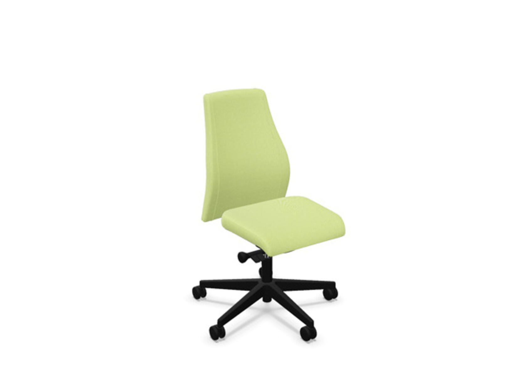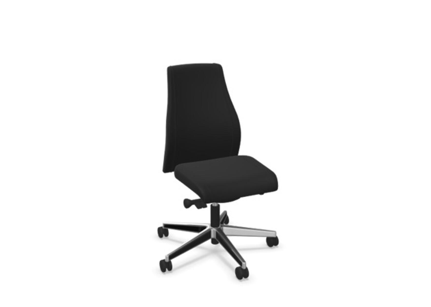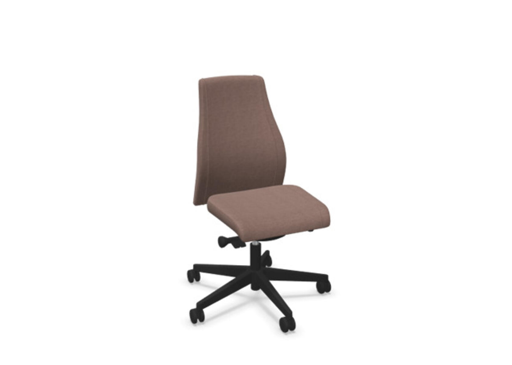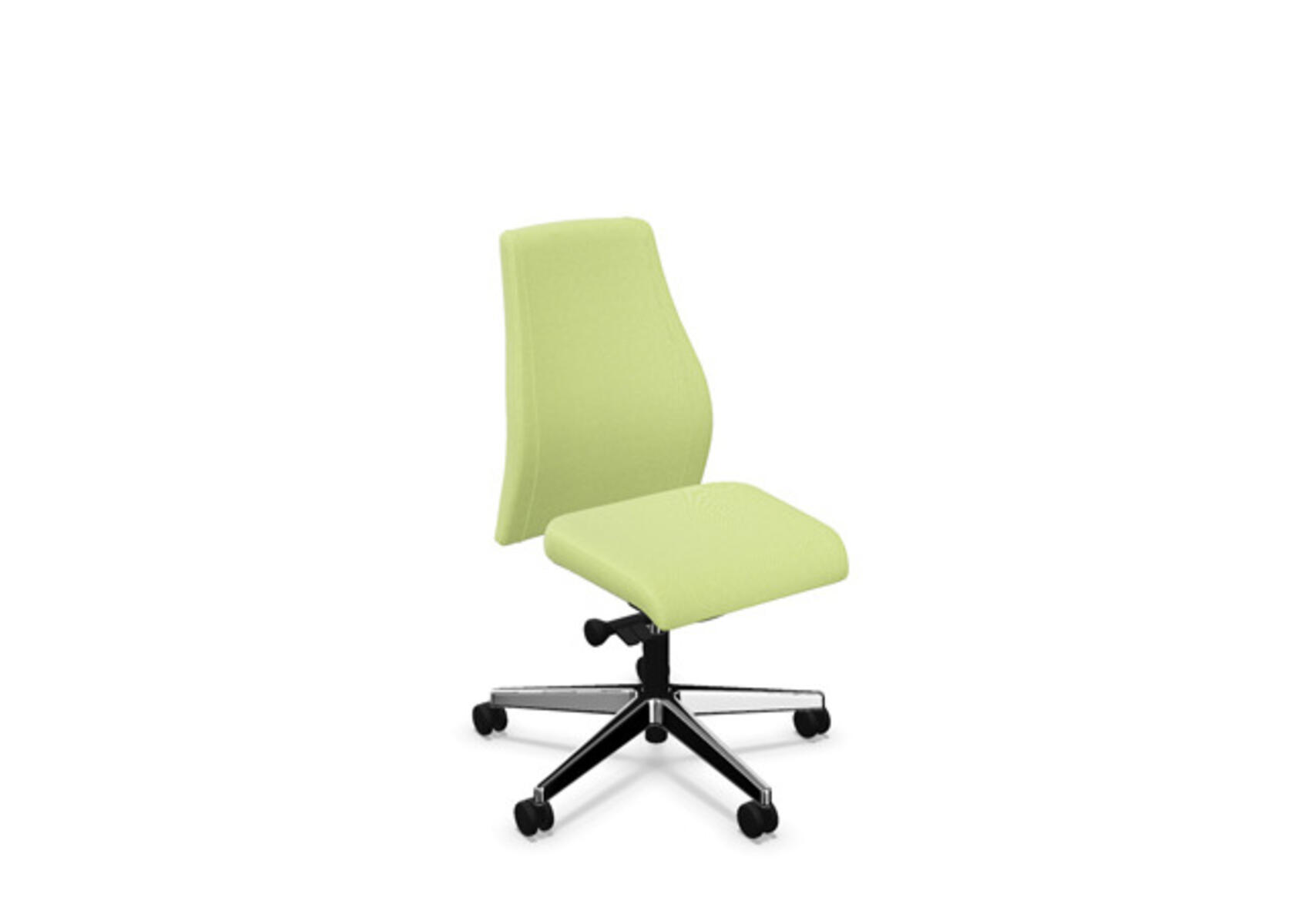 En stilren og ergonomisk kontorstol med fuldpolstret høj ryg og synkronmekanisme, designet til at give støtte ved aktiv siddestilling gennem hele arbejdsdagen. Polstret i slidstærkt polyesterstof. Den synkroniserede bevægelse mellem ryg og sæde giver en aktiv og behagelig siddestilling; ryglænet har en hældning på 20° synkroniseret med sædets 11°. Ryglænet kan låses i 5 positioner, og modstanden kan justeres via et drejehåndtag. Ryglænet kan højdejusteres 70 mm med 13 låsepositioner. Stolen har Anti-Shock-funktion, som forhindrer ryglænet i at slå frem, når låsen frigives. Vælg mellem kryds i sort polyamid eller poleret aluminium samt selvbremsende hjul til både hårde og bløde gulve. Som tilvalg kan der vælges lændestøtte, manuelt justerbar i dybden (20 mm) via et drejehåndtag. Armlæn i 2D, 3D eller 4D købes separat.