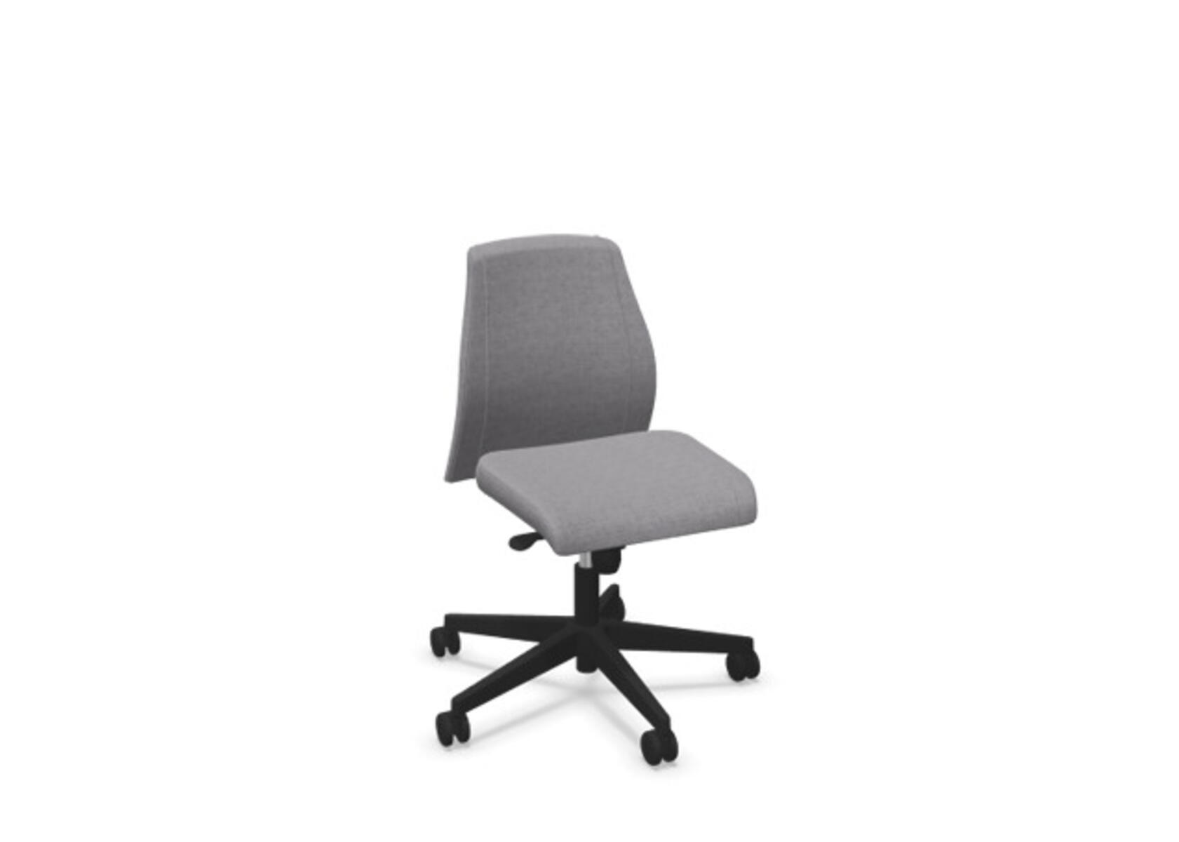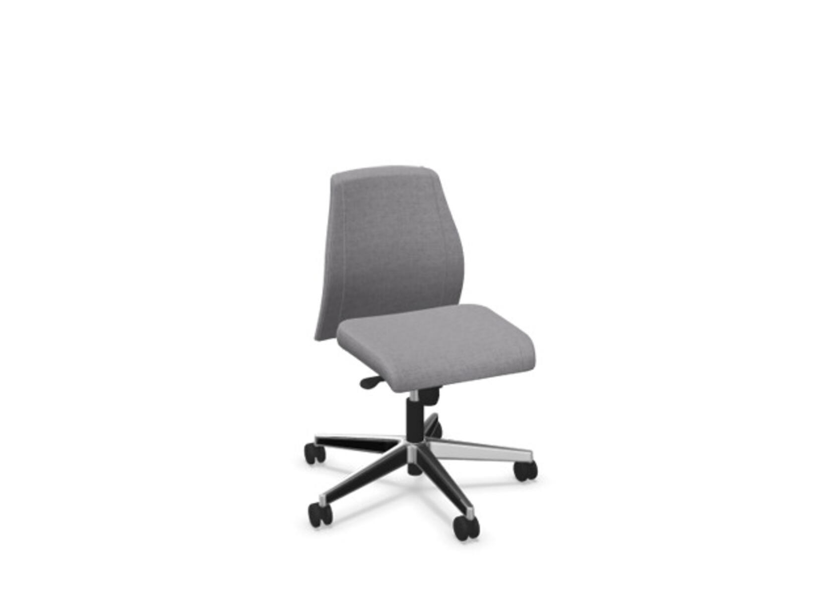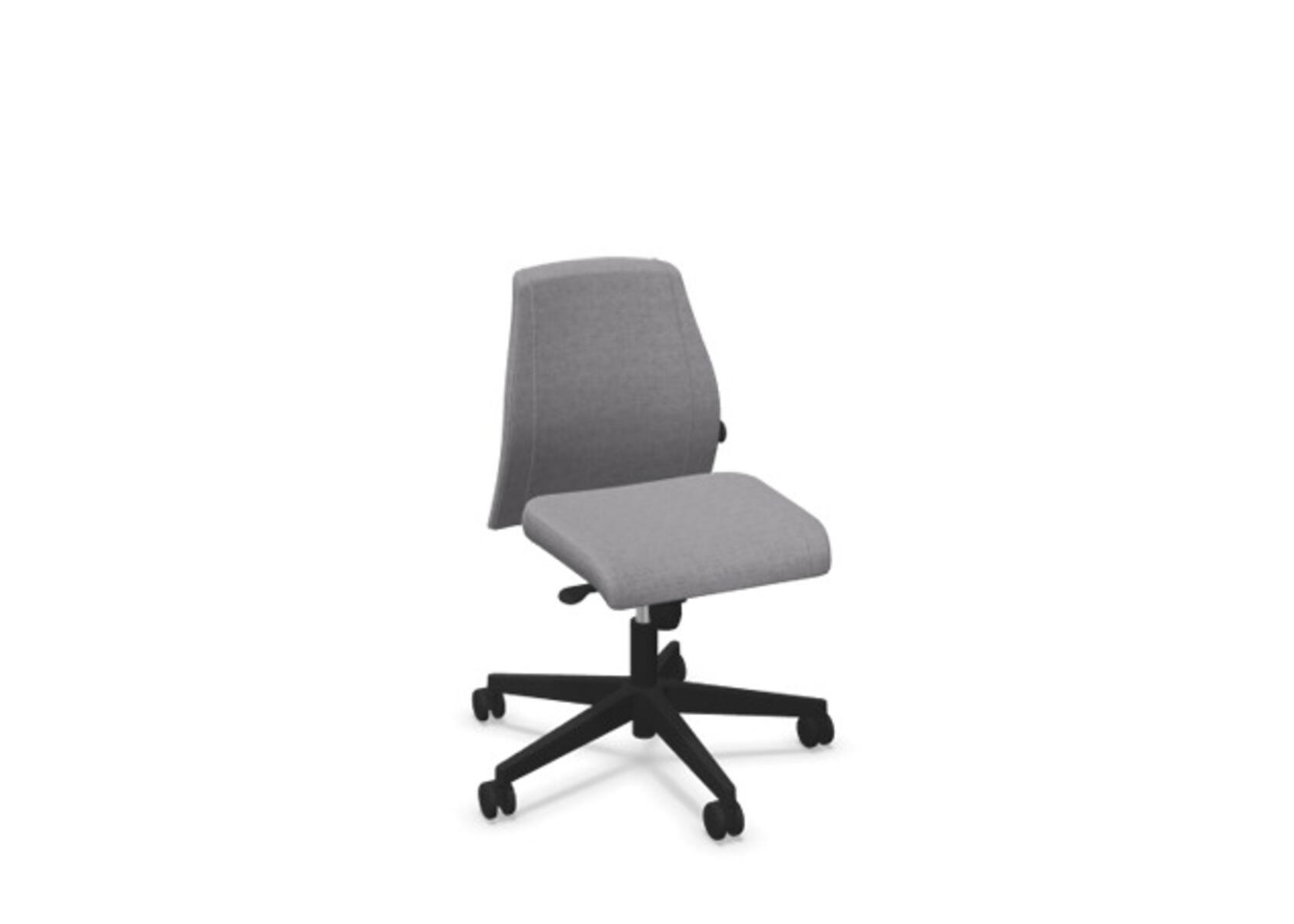 En stilren og ergonomisk kontorstol med fuldpolstret lav ryg og synkronmekanisme, designet til at give støtte ved aktiv siddestilling gennem hele arbejdsdagen. Polstret i slidstærkt polyesterstof. Den synkroniserede bevægelse mellem ryg og sæde giver en aktiv og behagelig siddestilling; ryglænet har en hældning på 20° synkroniseret med sædets 11°. Ryglænet kan låses i 5 positioner, og modstanden kan justeres via et drejehåndtag. Ryglænet kan højdejusteres 70 mm med 13 låsepositioner. Stolen har Anti-Shock-funktion, som forhindrer ryglænet i at slå frem, når låsen frigives. Vælg mellem kryds i sort polyamid eller poleret aluminium samt selvbremsende hjul til både hårde og bløde gulve. Som tilvalg kan der tilføjes lændestøtte, manuelt justerbar i dybden (20 mm). Armlæn i 2D, 3D eller 4D købes separat.