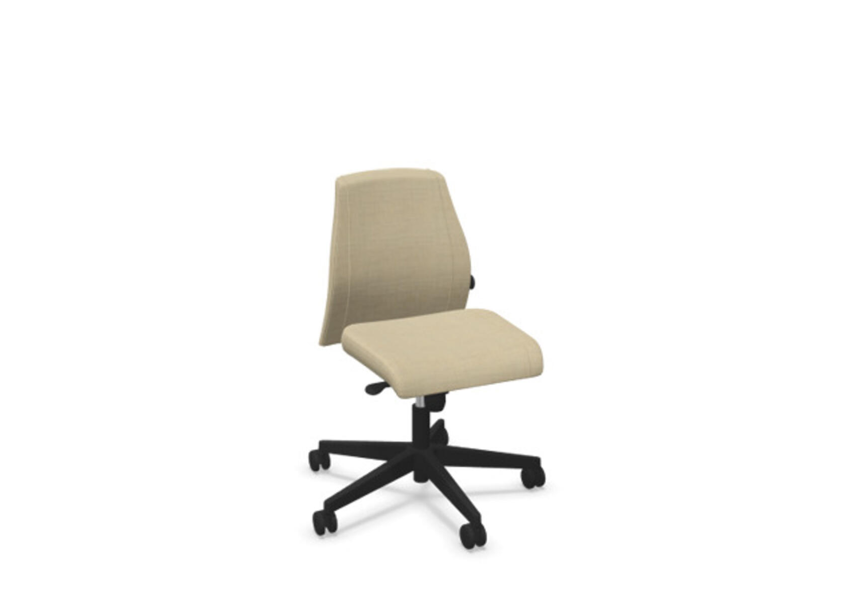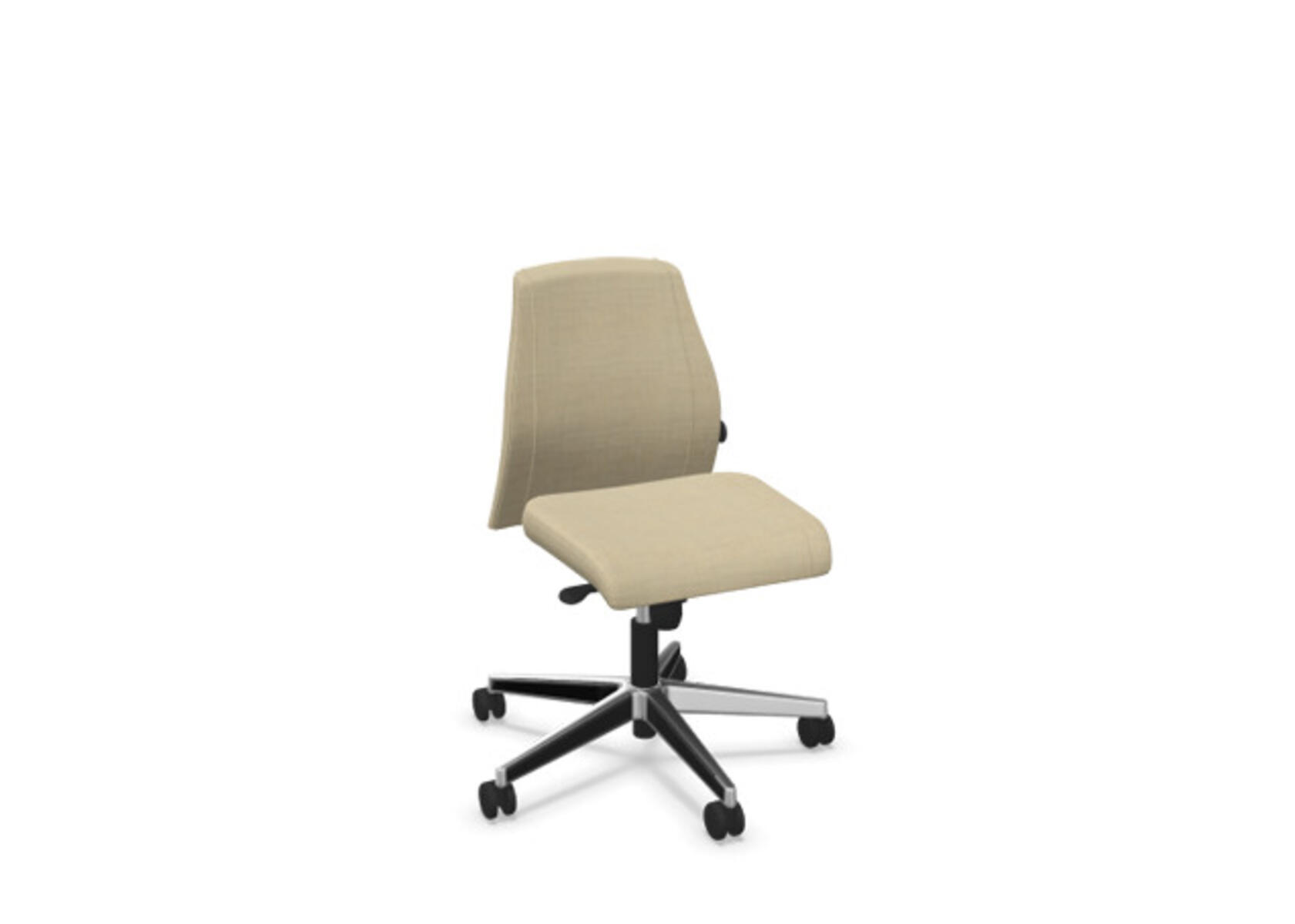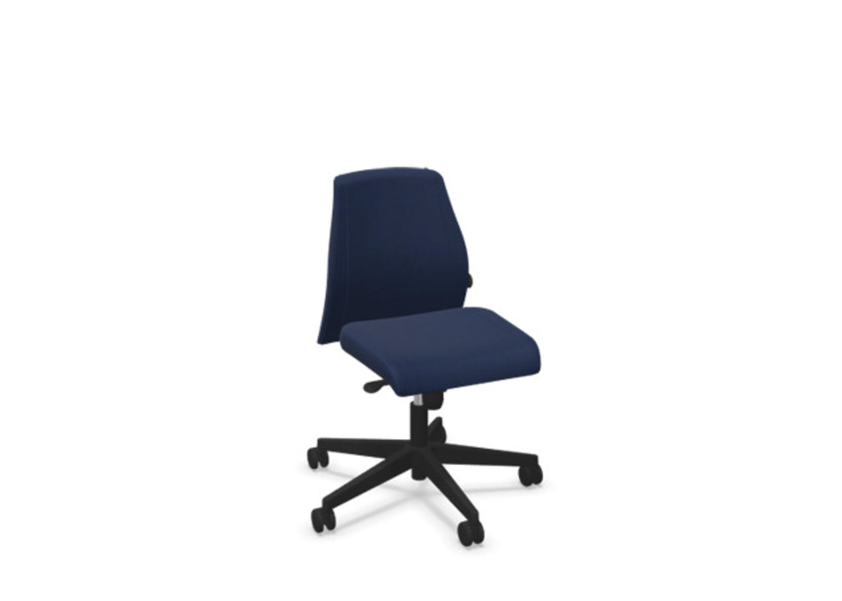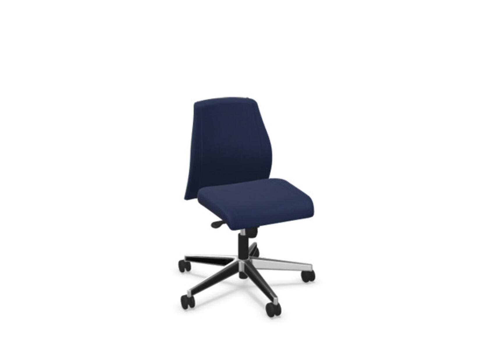 En stilren og ergonomisk kontorstol med fuldpolstret lav ryg og synkronmekanisme, designet til at give støtte ved aktiv siddestilling gennem hele arbejdsdagen. Polstret i slidstærkt polyesterstof. Den synkroniserede bevægelse mellem ryg og sæde giver en aktiv og behagelig siddestilling; ryglænet har en hældning på 20° synkroniseret med sædets 11°. Ryglænet kan låses i 5 positioner, og modstanden kan justeres via et drejehåndtag. Ryglænet kan højdejusteres 70 mm med 13 låsepositioner. Stolen har Anti-Shock-funktion, som forhindrer ryglænet i at slå frem, når låsen frigives. Vælg mellem kryds i sort polyamid eller poleret aluminium samt selvbremsende hjul til både hårde og bløde gulve. Som tilvalg kan der tilføjes lændestøtte, manuelt justerbar i dybden (20 mm). Armlæn i 2D, 3D eller 4D købes separat.