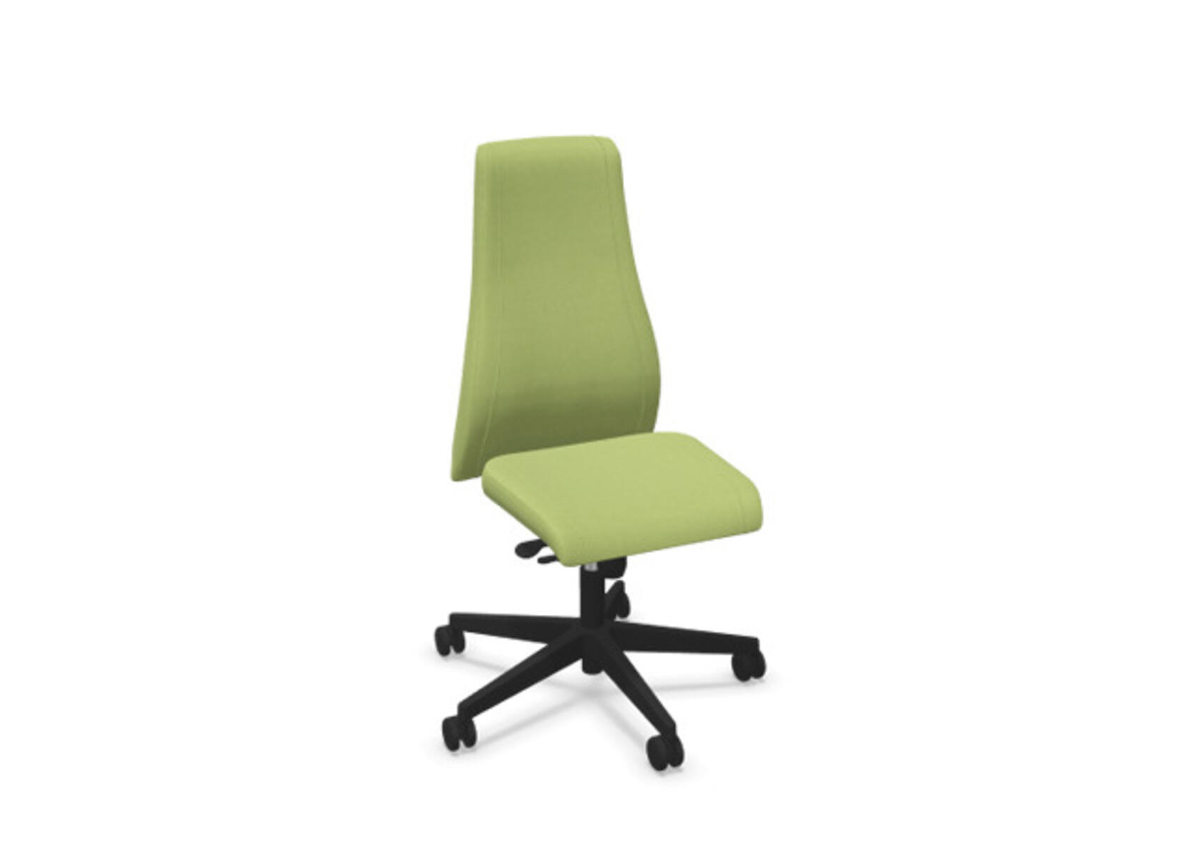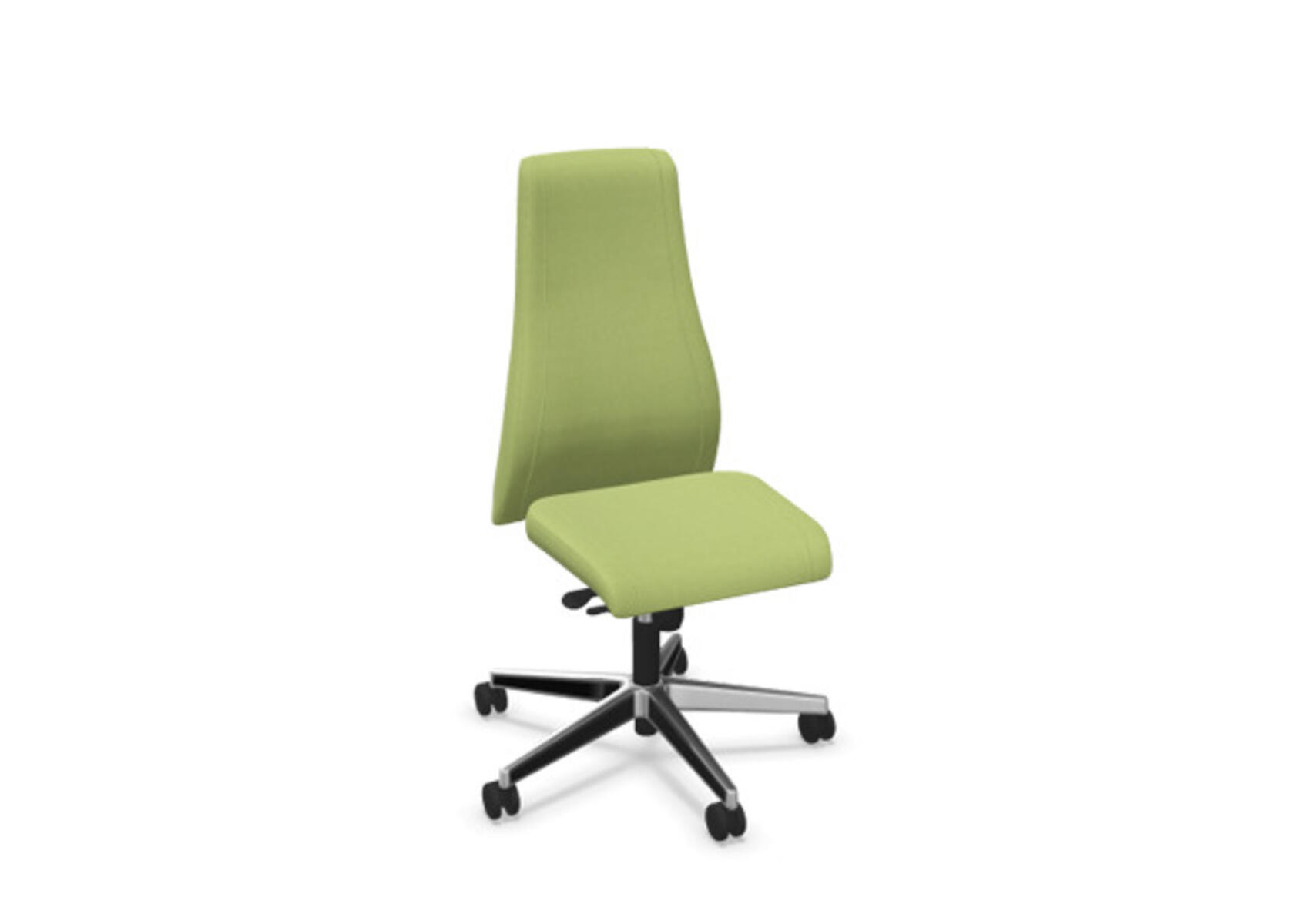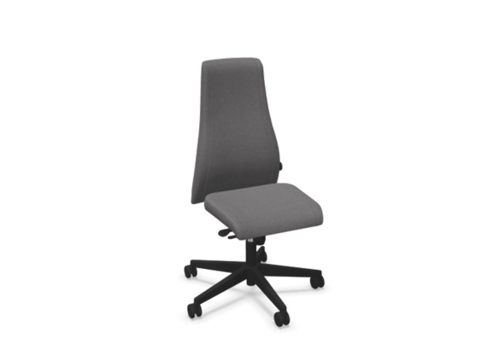 En stilren og ergonomisk kontorstol med fuldpolstret høj ryg og synkronmekanisme, designet til at give støtte ved aktiv siddestilling gennem hele arbejdsdagen. Polstret i slidstærkt polyesterstof. Den synkroniserede bevægelse mellem ryg og sæde giver en aktiv og behagelig siddestilling; ryglænet har en hældning på 20° synkroniseret med sædets 11°. Ryglænet kan låses i 5 positioner, og modstanden kan justeres via et drejehåndtag. Ryglænet kan højdejusteres 70 mm med 13 låsepositioner. Stolen har Anti-Shock-funktion, som forhindrer ryglænet i at slå frem, når låsen frigives. Vælg mellem kryds i sort polyamid eller poleret aluminium samt selvbremsende hjul til både hårde og bløde gulve. Som tilvalg kan der vælges lændestøtte, manuelt justerbar i dybden (20 mm) via et drejehåndtag. Armlæn i 2D, 3D eller 4D købes separat.