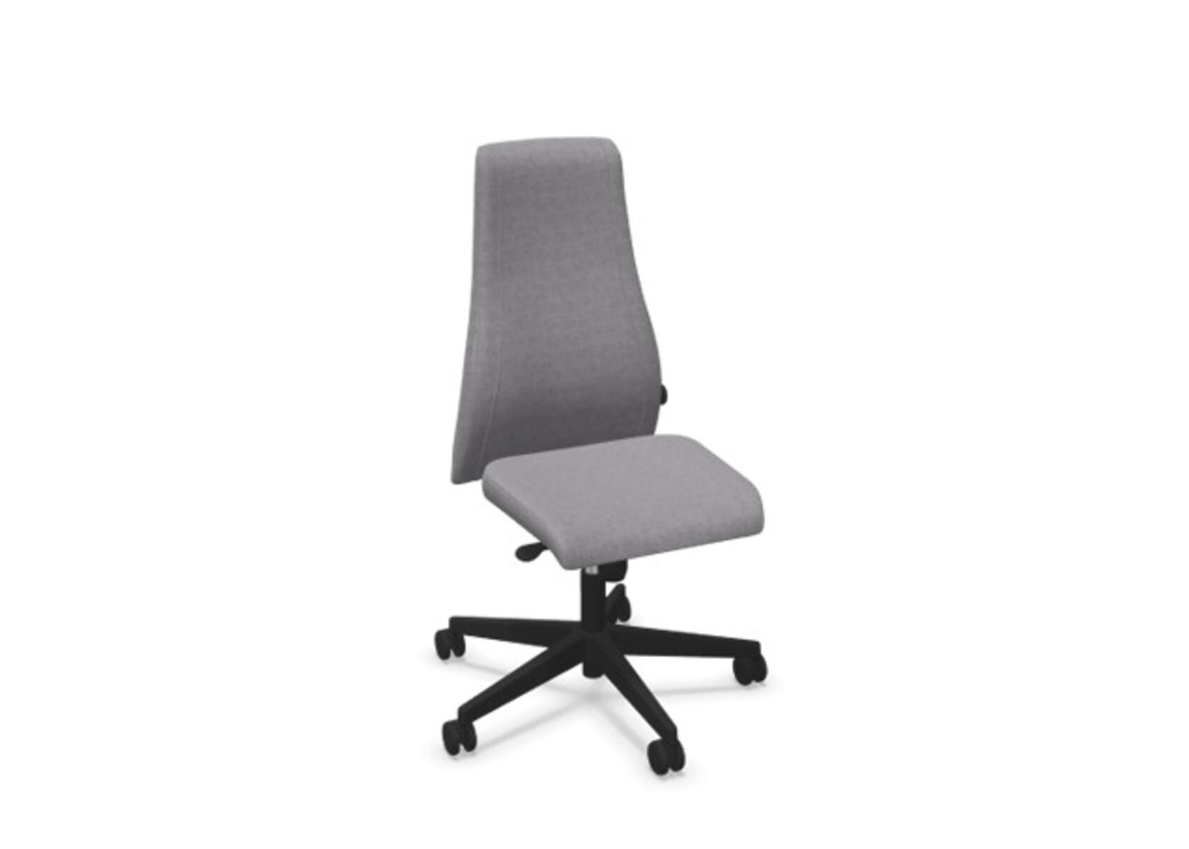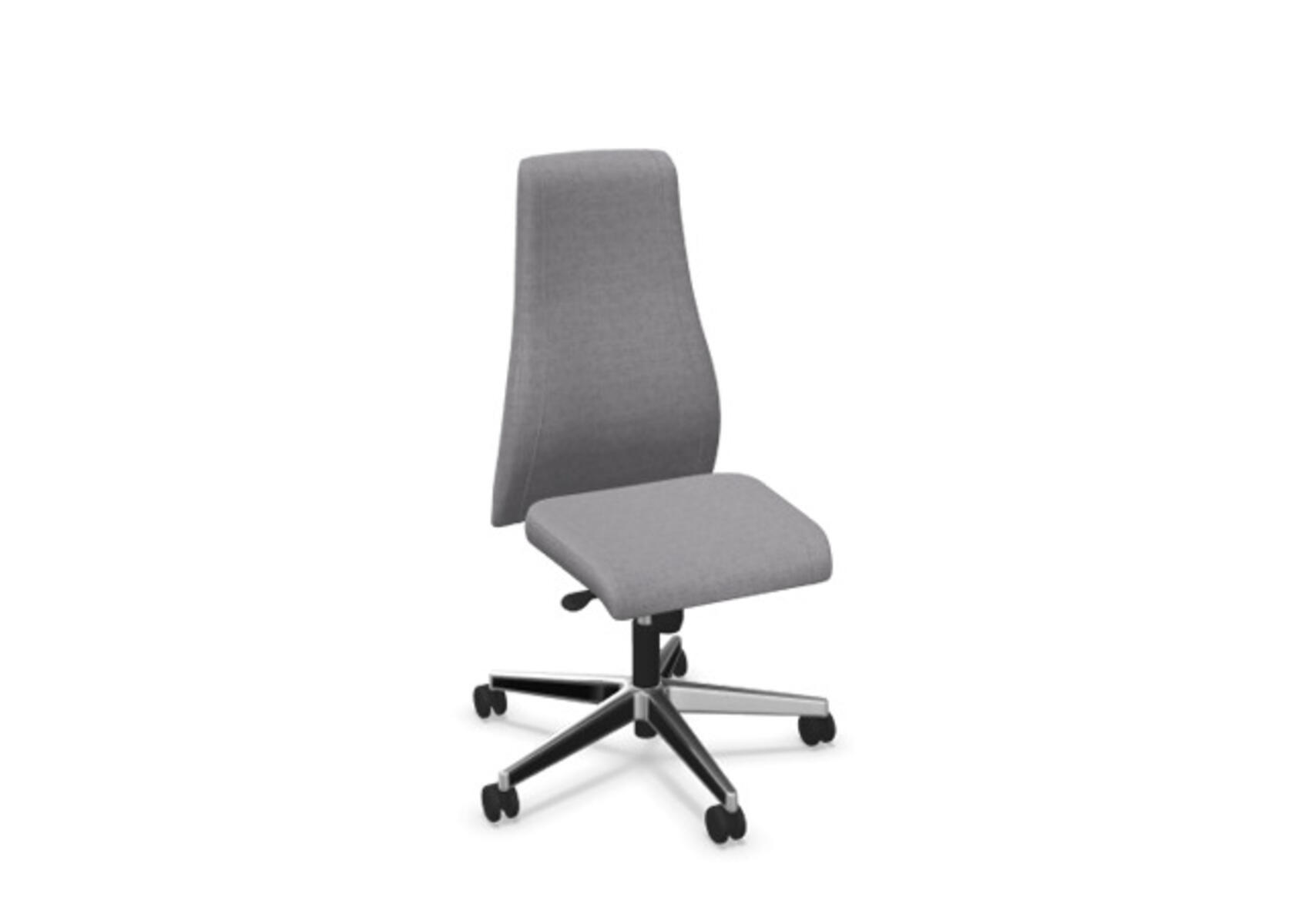 En stilren og ergonomisk kontorstol med fuldpolstret høj ryg og synkronmekanisme, designet til at give støtte ved aktiv siddestilling gennem hele arbejdsdagen. Polstret i slidstærkt polyesterstof. Den synkroniserede bevægelse mellem ryg og sæde giver en aktiv og behagelig siddestilling; ryglænet har en hældning på 20° synkroniseret med sædets 11°. Ryglænet kan låses i 5 positioner, og modstanden kan justeres via et drejehåndtag. Ryglænet kan højdejusteres 70 mm med 13 låsepositioner. Stolen har Anti-Shock-funktion, som forhindrer ryglænet i at slå frem, når låsen frigives. Vælg mellem kryds i sort polyamid eller poleret aluminium samt selvbremsende hjul til både hårde og bløde gulve. Som tilvalg kan der vælges lændestøtte, manuelt justerbar i dybden (20 mm) via et drejehåndtag. Armlæn i 2D, 3D eller 4D købes separat.