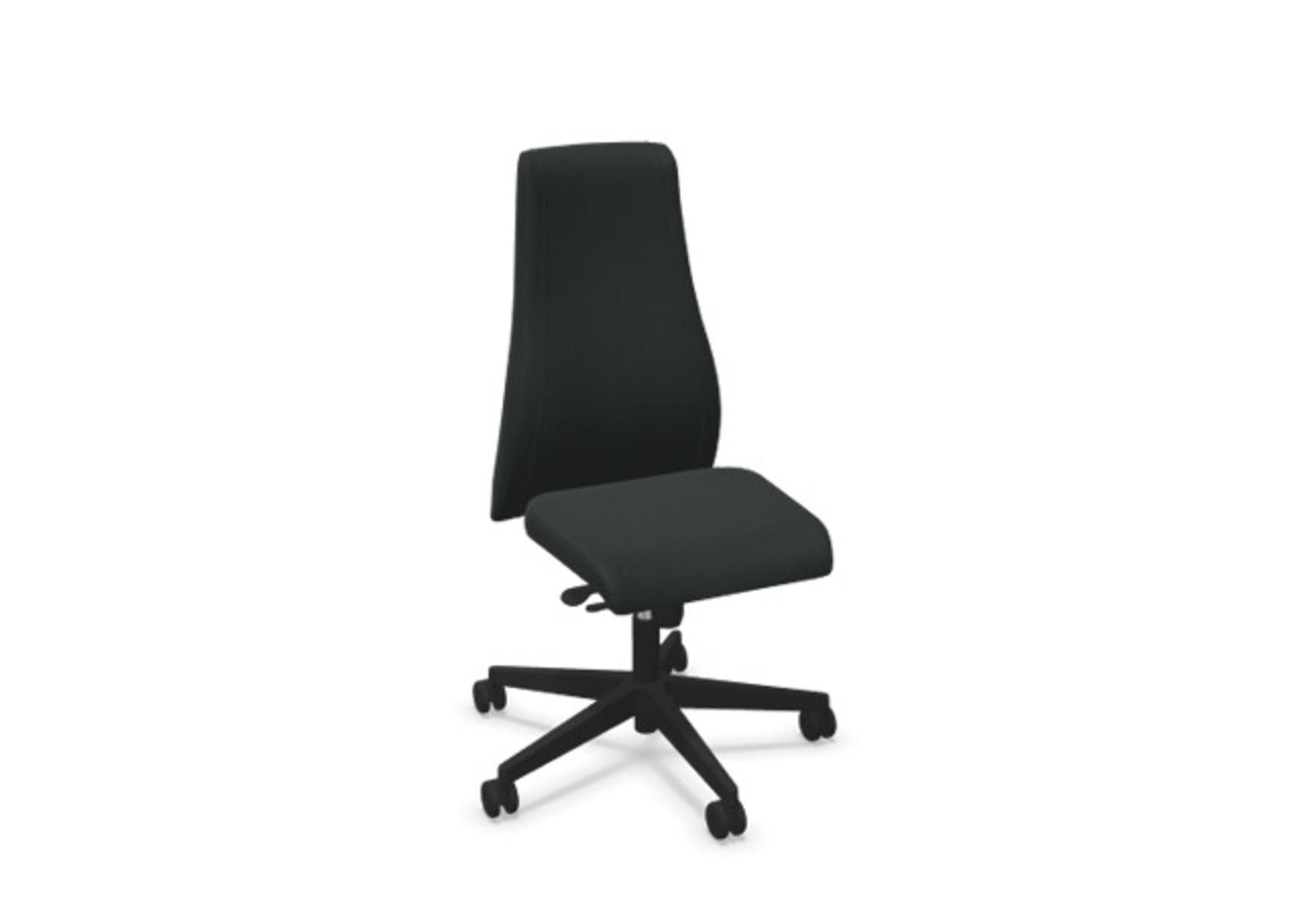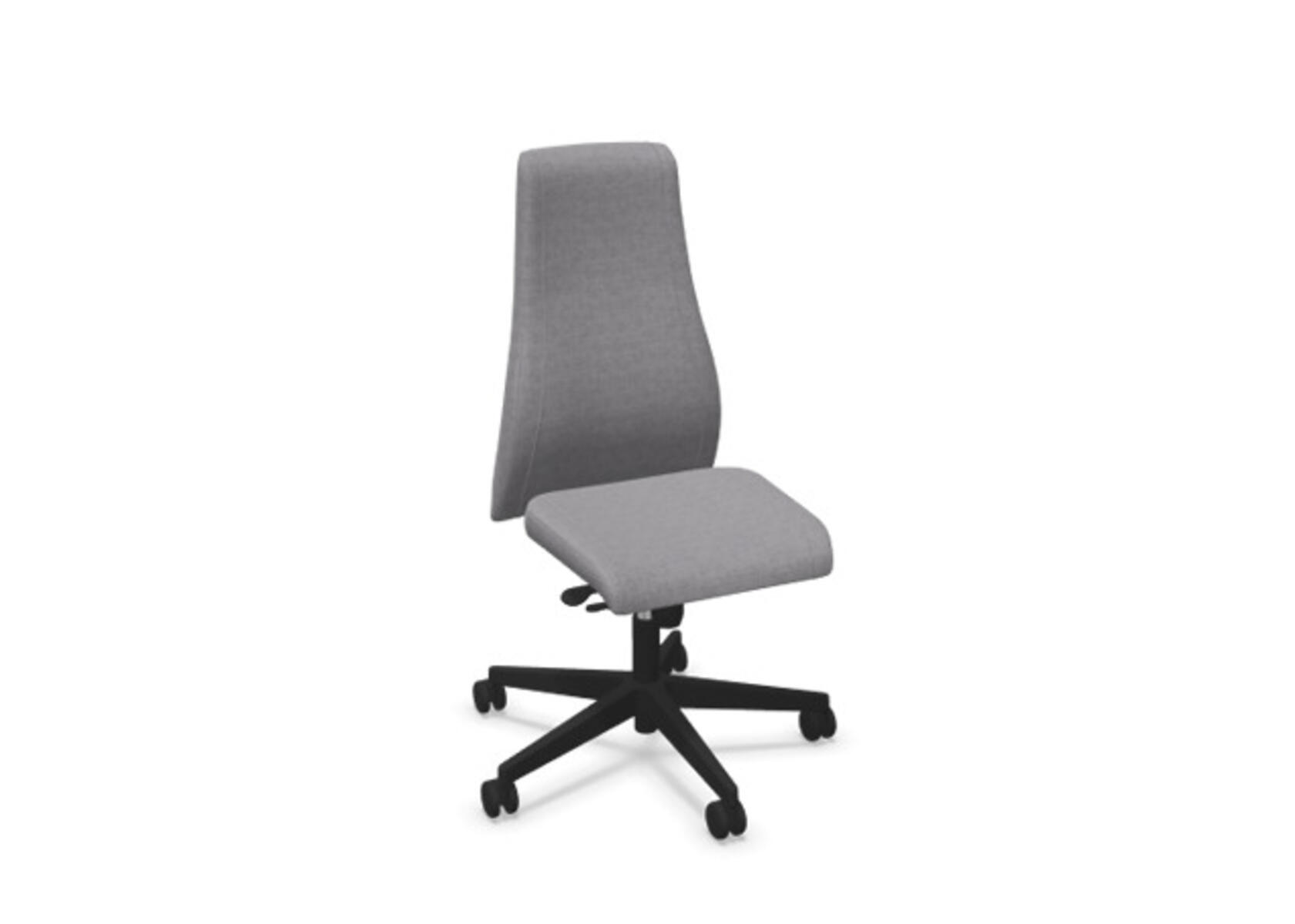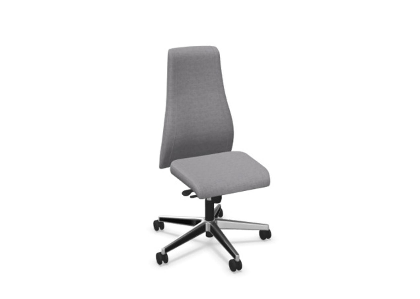 En stilren og ergonomisk kontorstol med fuldpolstret høj ryg og synkronmekanisme, designet til at give støtte ved aktiv siddestilling gennem hele arbejdsdagen. Polstret i slidstærkt polyesterstof. Den synkroniserede bevægelse mellem ryg og sæde giver en aktiv og behagelig siddestilling; ryglænet har en hældning på 20° synkroniseret med sædets 11°. Ryglænet kan låses i 5 positioner, og modstanden kan justeres via et drejehåndtag. Ryglænet kan højdejusteres 70 mm med 13 låsepositioner. Stolen har Anti-Shock-funktion, som forhindrer ryglænet i at slå frem, når låsen frigives. Vælg mellem kryds i sort polyamid eller poleret aluminium samt selvbremsende hjul til både hårde og bløde gulve. Som tilvalg kan der vælges lændestøtte, manuelt justerbar i dybden (20 mm) via et drejehåndtag. Armlæn i 2D, 3D eller 4D købes separat.