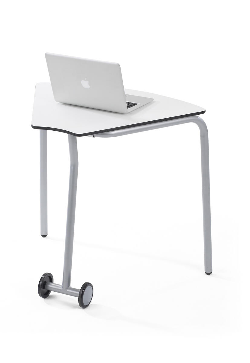 Elevbord B76xD60xH72 cm med understel i metal RAL 9006. Plade i hvid kompaktlaminat. Bordpladen kan vippes op ved opbevaring. Hjul foran. 60°, kræver 6 borde for at lave en cirkel.