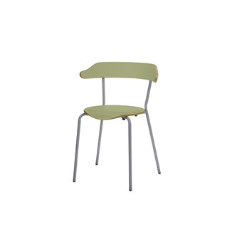 Massiv birk. Formpresset sæde og ryg. Sæde belagt med linoleum. Med lyddæmpning under sæde. Kan stables eller hænges på bordplade. Siddehøjde 45 cm, siddedybde 41 cm.