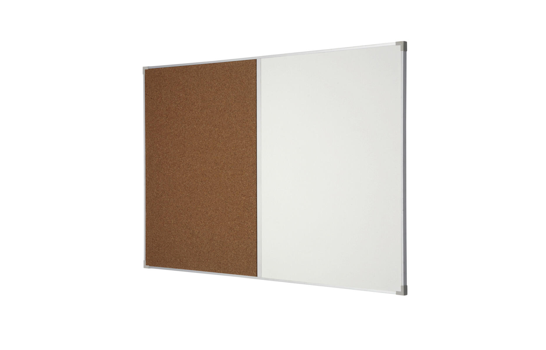 Den ene halvdel af tavlen er whiteboard med magnetfuntion og den anden halvdel er opslagstavle af naturkork. Ramme af aluminium. Tuschholder medfølger.