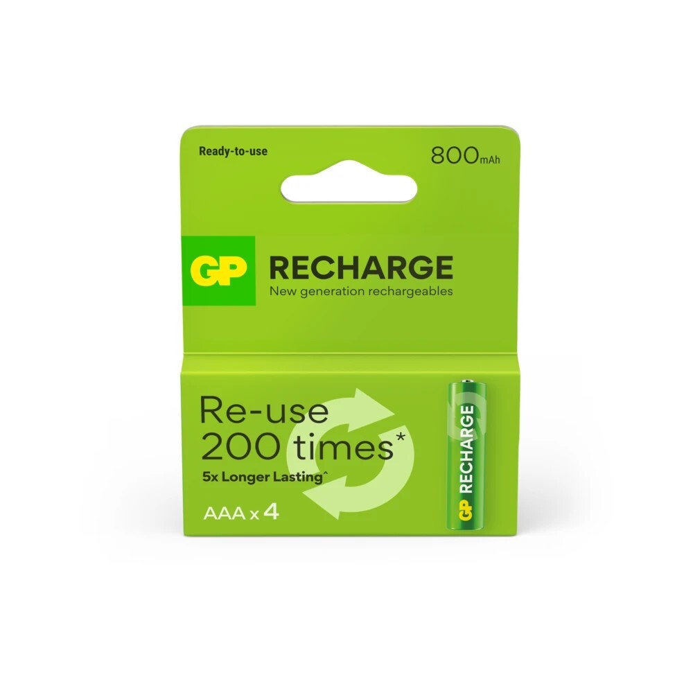 4 stk./pk. Opladelige GP Recharge AAA-batterier, 800 mAh. Et miljøvenligt valg, der erstatter engangsbatterier. Forlades fra start og kan oplades op til 200 gange. Holder op til 5× længere end engangsbatterier og bevarer ladningen i op til 1 år uden brug. Oplades med lader varenr. 25138 eller 133330. NiMH.