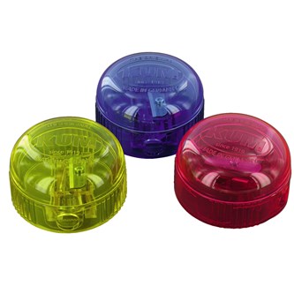 1 stk./pk. KUM 4-i-1 blyantspidser til runde, sekskantede og trekantede blyanter. 4 huller til blyanter med Ø7, 8, 10 og 11 mm. Rummelig og transparent beholder af plast med fliplock over hullerne. Assorterede farver. Mål: 4,5x3,5x6 cm. Fra 3 år.