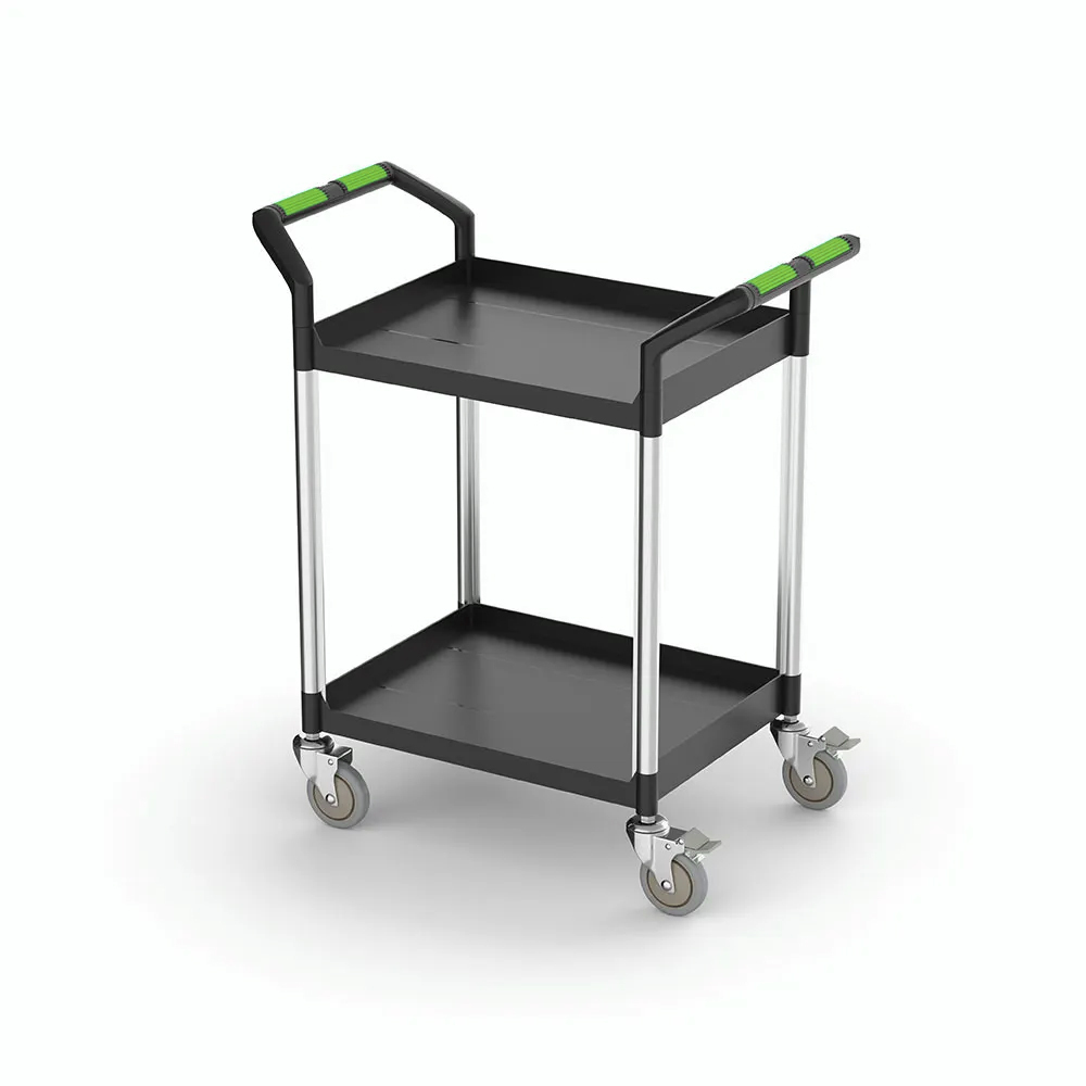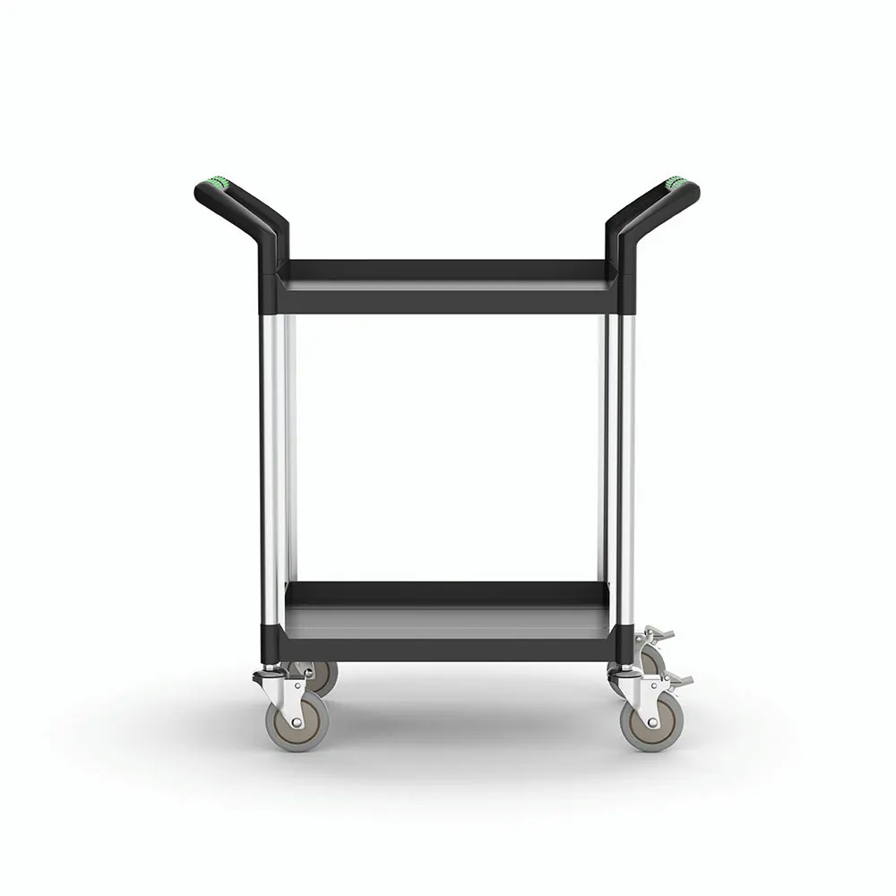 Alsidig transport- og opbevaringsvogn med to kemikalieresistente hylder. Udstyret med gummihjul med 360° bevægelighed, hvoraf to har bremser. Arbejdsbelastning: 250 kg. Nem montering med tydelig vejledning, inkl. gummikølle til montering. Hylder af forstærket, genanvendt polypropylen (PP) og stel af aluminium. Mål: hylder 680×450×25 mm, afstand mellem hylder 550 mm.