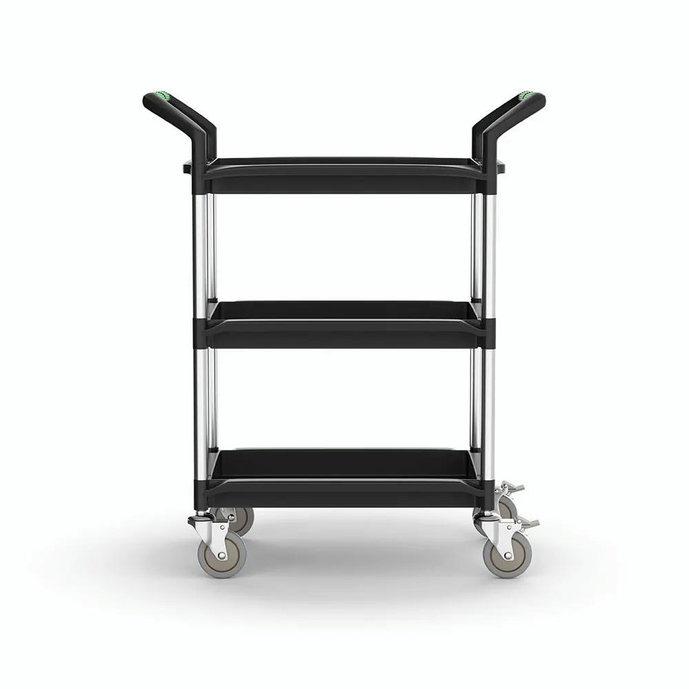 Alsidig transport- og opbevaringsvogn med tre dybe, kemikalieresistente hylder. De 10 cm høje hyldekanter gør vognen særligt velegnet til transport af skrøbeligt materiale. Udstyret med drejehjul af gummi, der giver 360° bevægelighed – to af hjulene har bremser. Arbejdsbelastning: 250 kg. Nem montering med tydelige instruktioner, inkl. gummikølle til montering. Hylder af forstærket genanvendt polypropylen (PP) og ramme af aluminium. Mål: hylder 710×475×100 mm, afstand mellem hylder 300 mm.