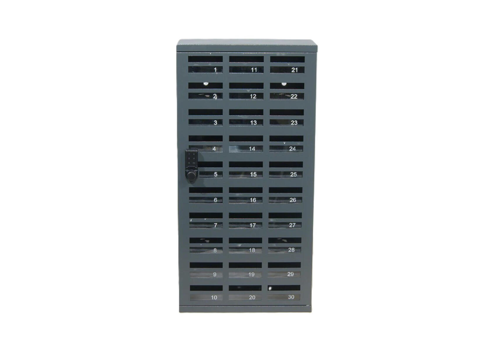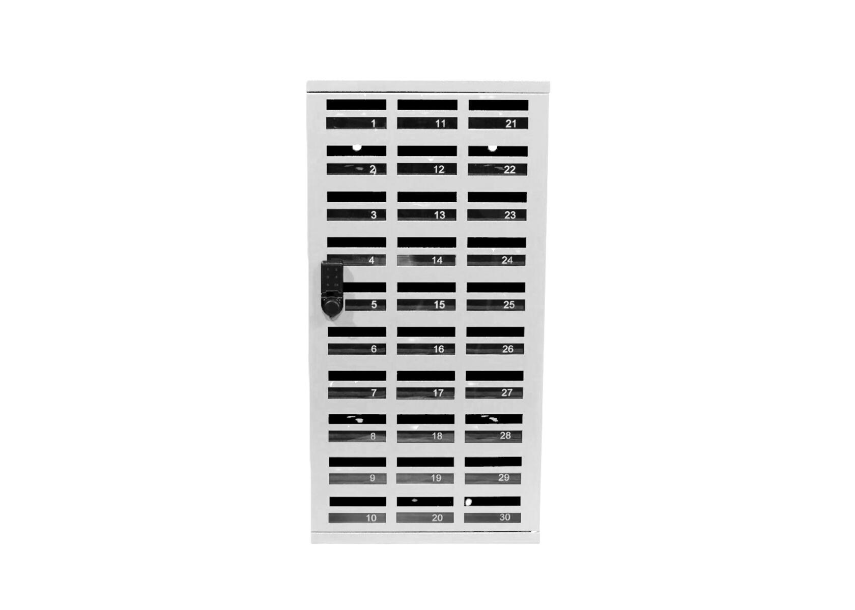 Mobilskab med 30 separate rum til mobiltelefoner. Hul i bagsiden af hvert rum til ladekabel. Mål pr. rum: B115 × D170 × H30 mm. Nøglelås, 2 nøgler medfølger. Til vægmontering, skruer medfølger ikke.