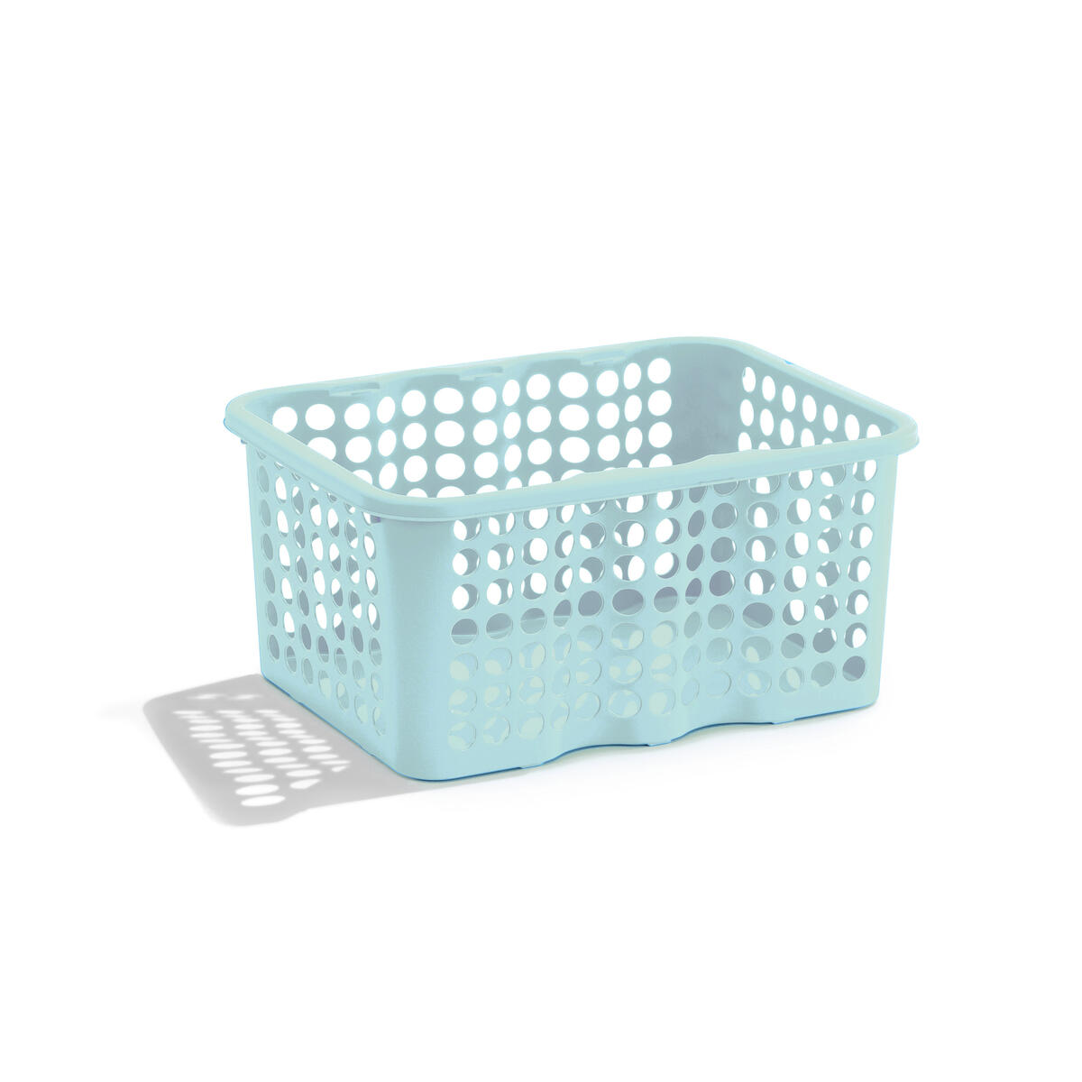 Opbevaringskurv/indkøbskurv med håndtag. Til flytning af materialer mellem klasselokalet og skolegården eller til at tage med på udflugter m.m. Stabil, solid og stabelbar kurv af genanvendt polypropylen. Bredt og gribevenligt håndtag af polypropen og glasfiber. Mål: 48x33x25 cm.