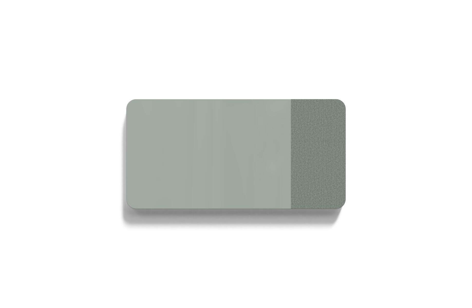 Tavle med en kombination af stofbeklædt overflade og magnetisk glasflade man kan skrive på samt lydabsorberende fyld. Den stofbeklædte overflade er 50 cm bred. Skjulte beslag.