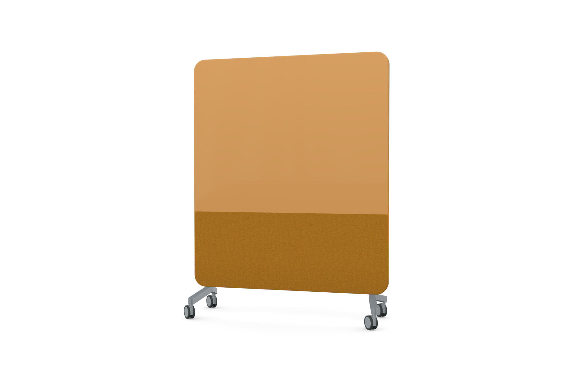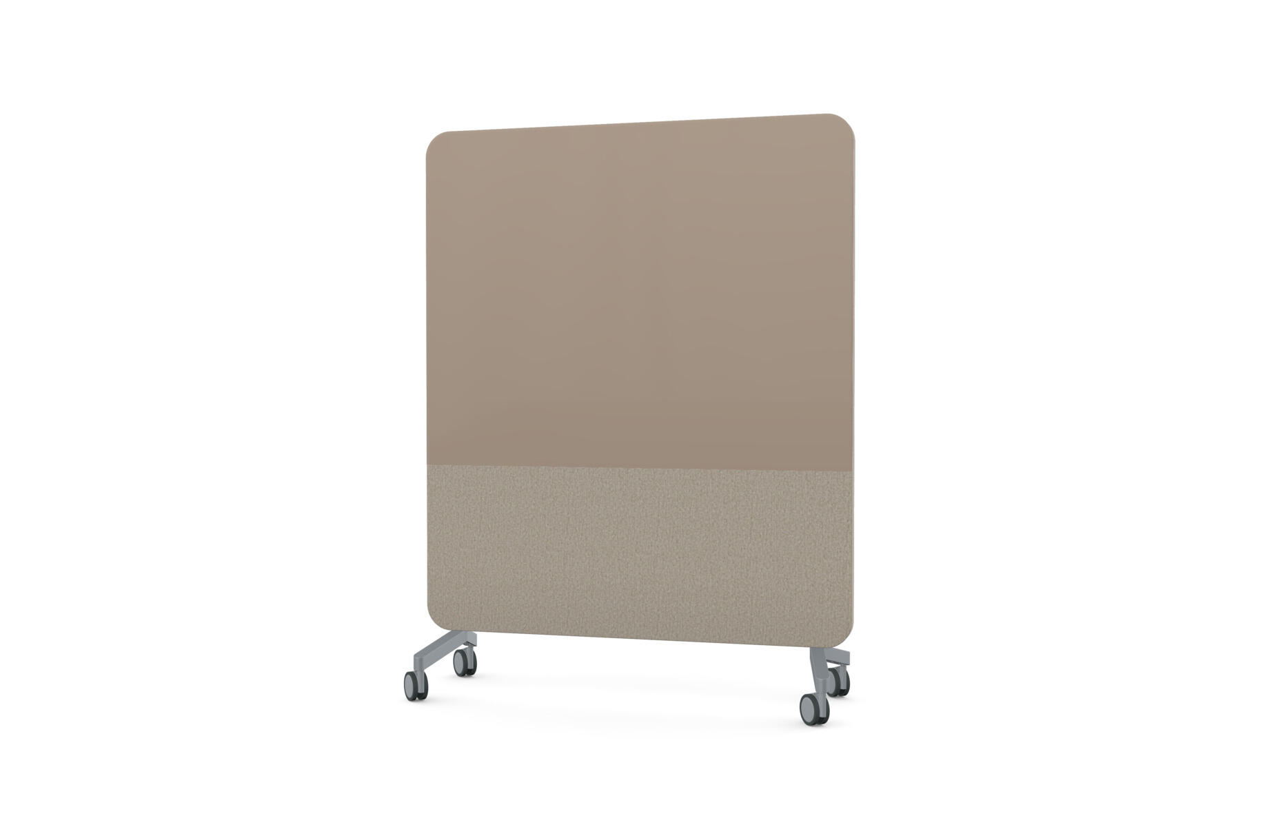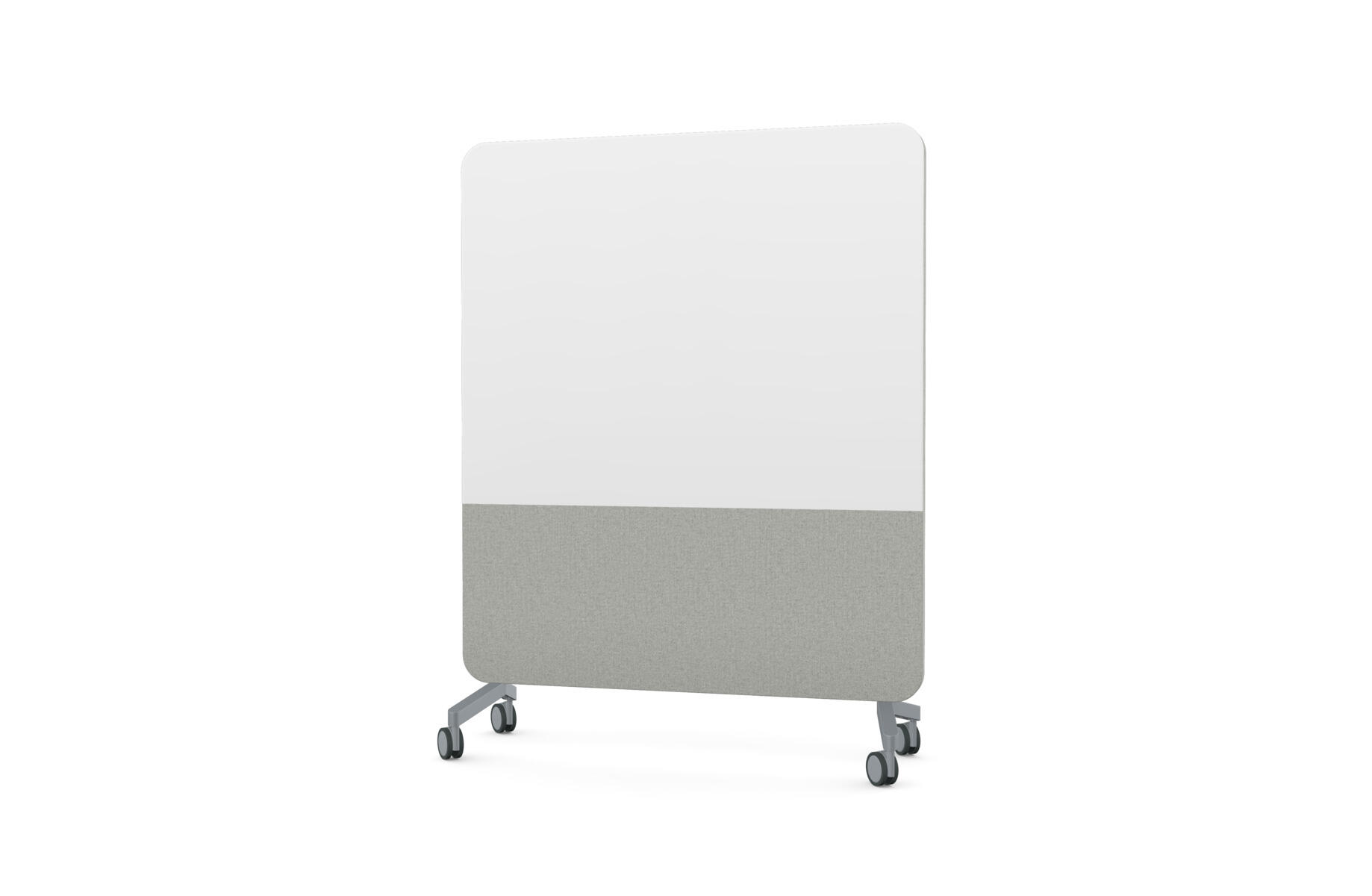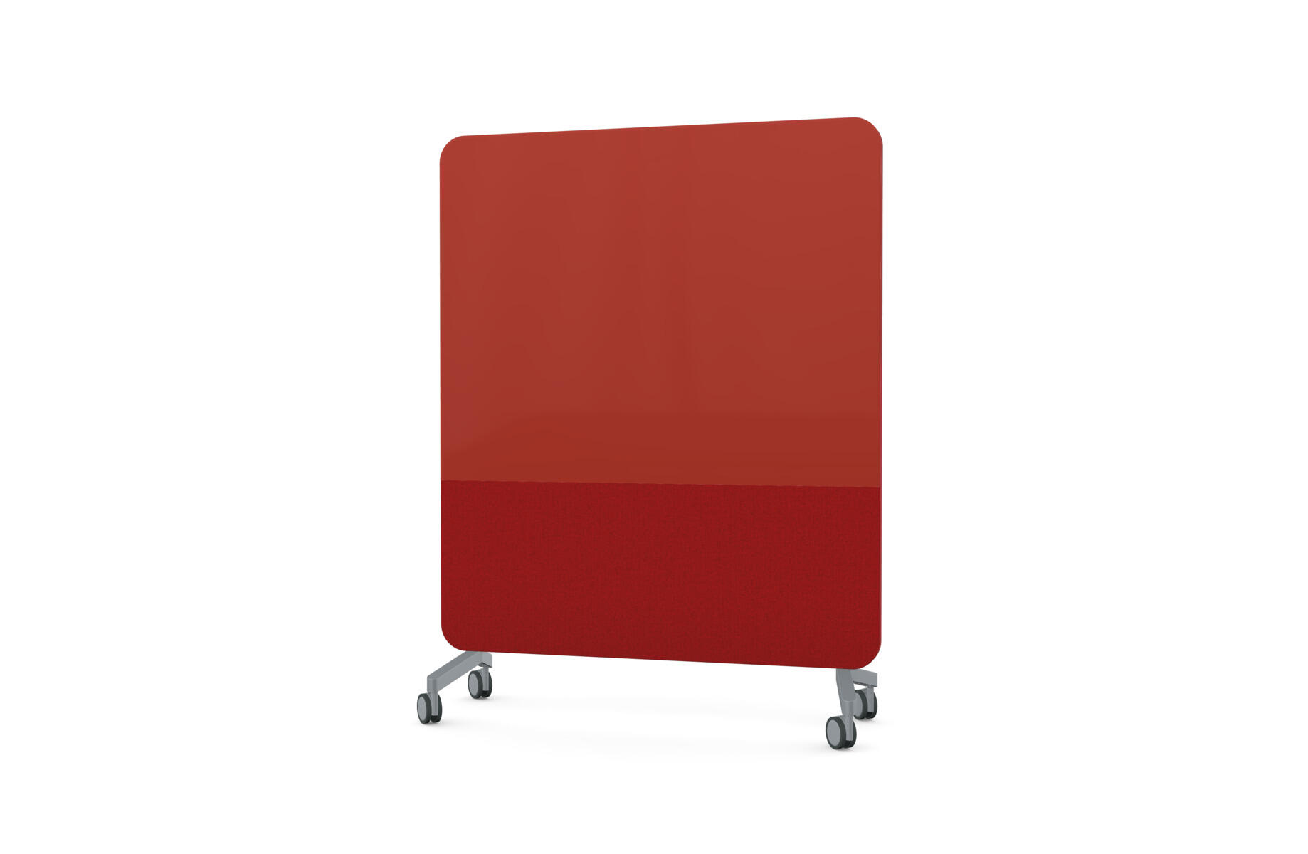 Mobil magnetbærende skrivetavle med fulddækkende glas på forsiden og stofbeklædt, nålefast bagside. Lydabsorberende fyld. Hærdet, optisk glas. Kræver særligt tilpassede, kraftigere magneter. Fås i flere udvalgte farvekombinationer. Fødder sælges separat.