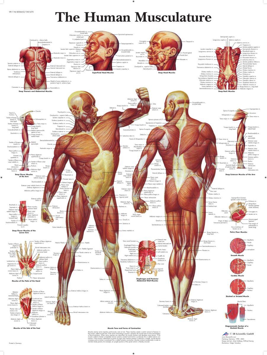 Lamineret planche med kroppens muskler. Overfladen er slidstærk og kan aftørres ved brug af ikke-permanent pen. Lamineret i miljøvenlig plast. Tekst på engelsk og detaljer angivet på latin. Mål 50 x 67 cm.
