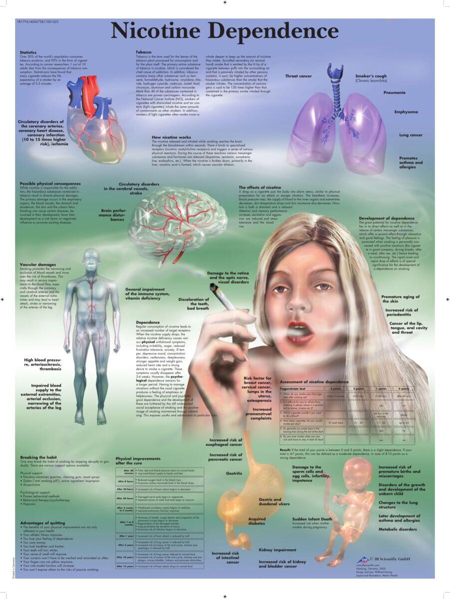 Lamineret planche med fakta om nikotin og dets effekter. Overfladen er slidstærk og kan aftørres ved brug af ikke-permanent pen. Tekst på engelsk. Lamineret i miljøvenlig plast. Mål 50 x 67 cm.