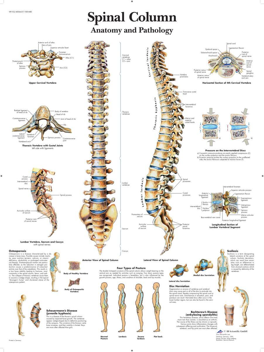 Lamineret planche, der viser rygsøjlens alle dele. Viser også ryghvirvler og diske i gennemskæring. Overfladen er slidstærk og kan aftørres ved brug af ikke-permanent pen. Lamineret i miljøvenlig plast. Tekst på engelsk og detaljer angivet på latin. Mål 50 x 67 cm.
