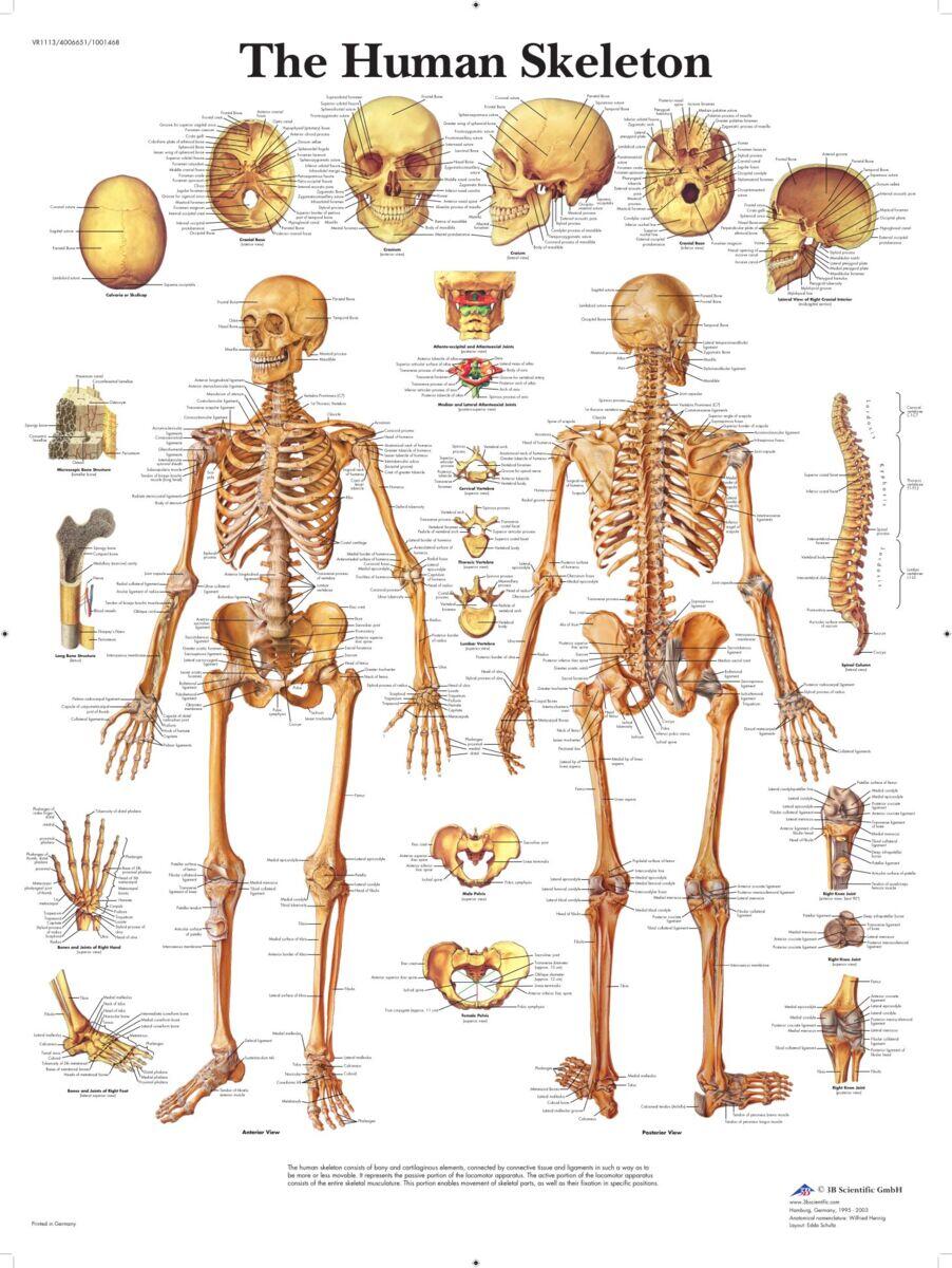 Lamineret planche med skelettets alle dele. Overfladen er slidstærk og kan aftørres ved brug af ikke-permanent pen. Lamineret i miljøvenlig plast. Tekst på engelsk og detaljer angivet på latin. Mål 50 x 67 cm.