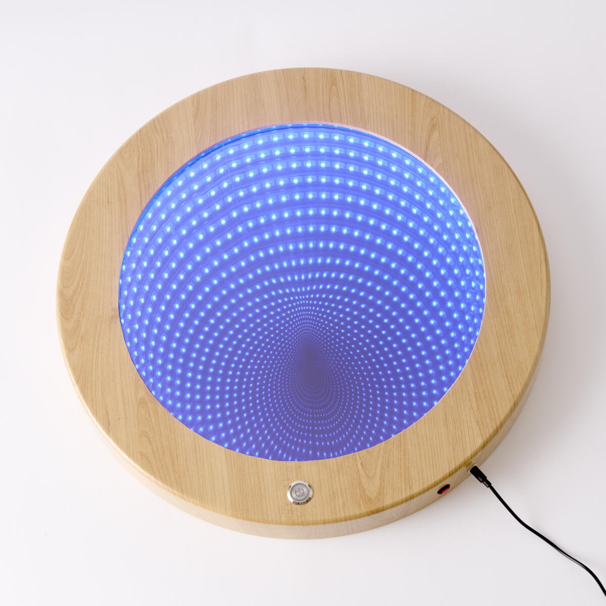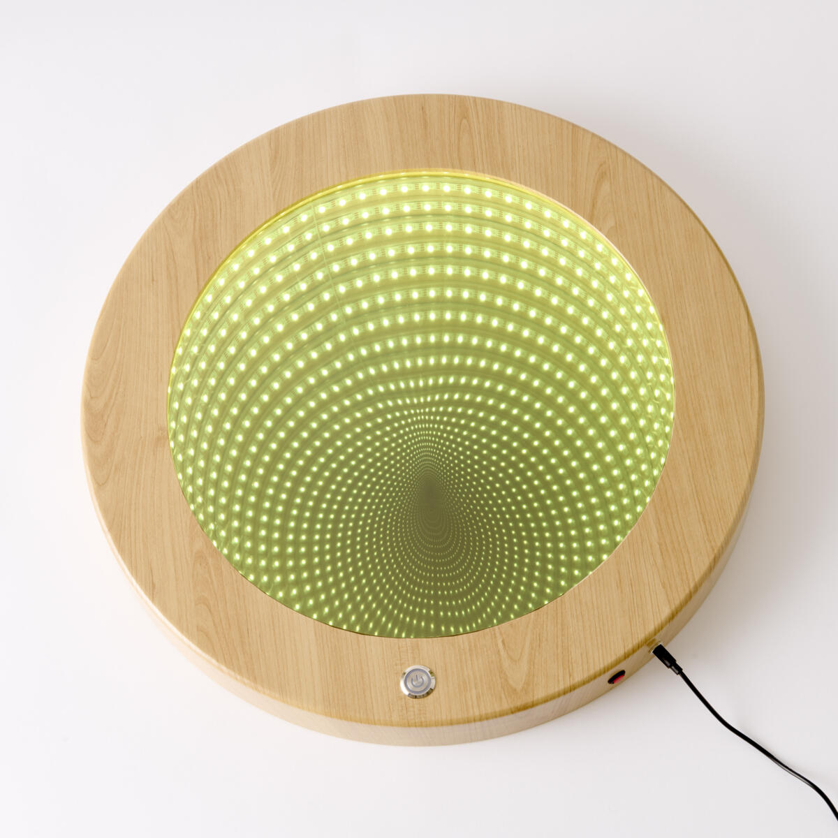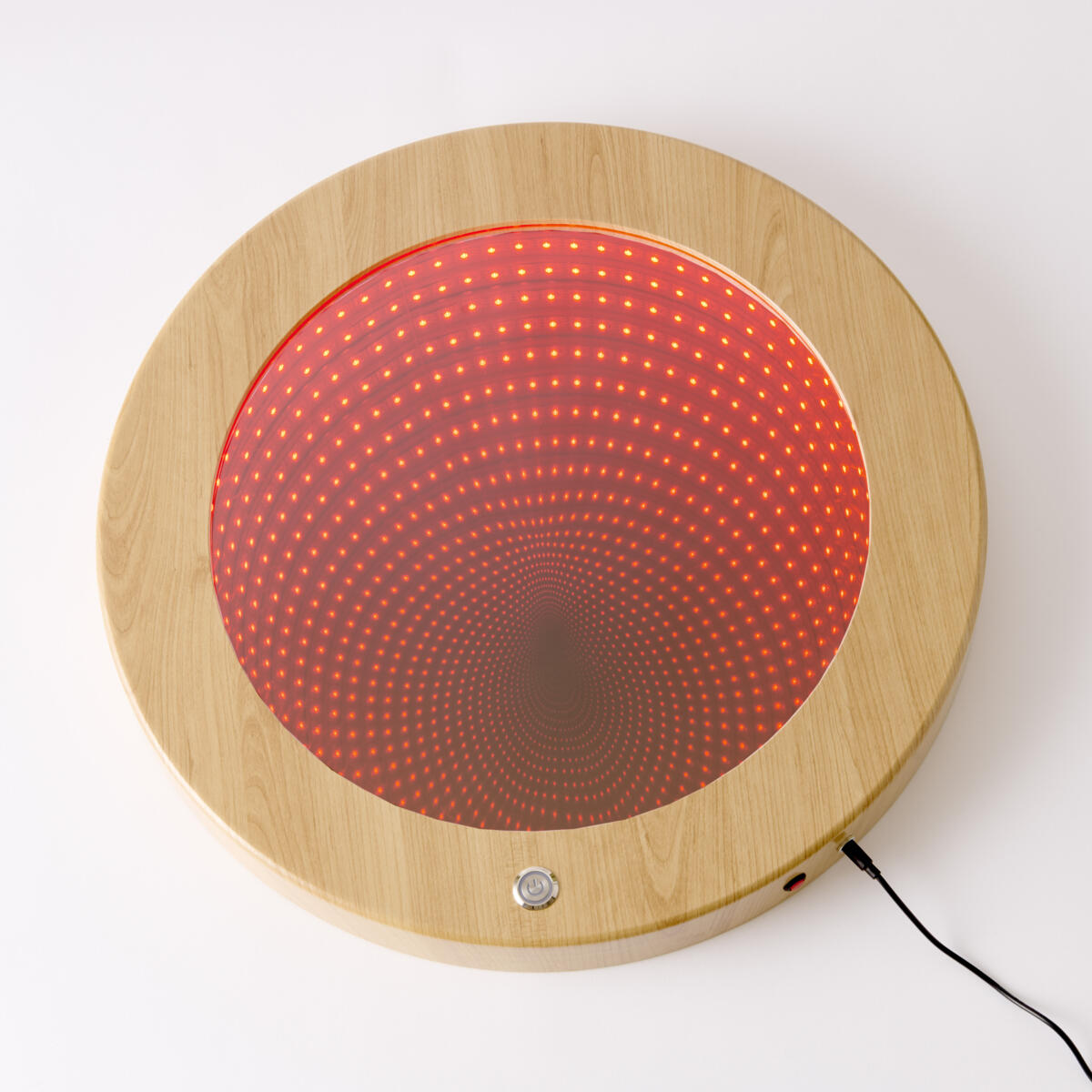 Et rundt spejl med farvede LED-pærer og reflekterende spejl, som giver et indtryk af uendelighed. Skaber ro og et afslappende miljø. Mål: 15 cm. Drives af 3xAAA-batterier, som købes separat.