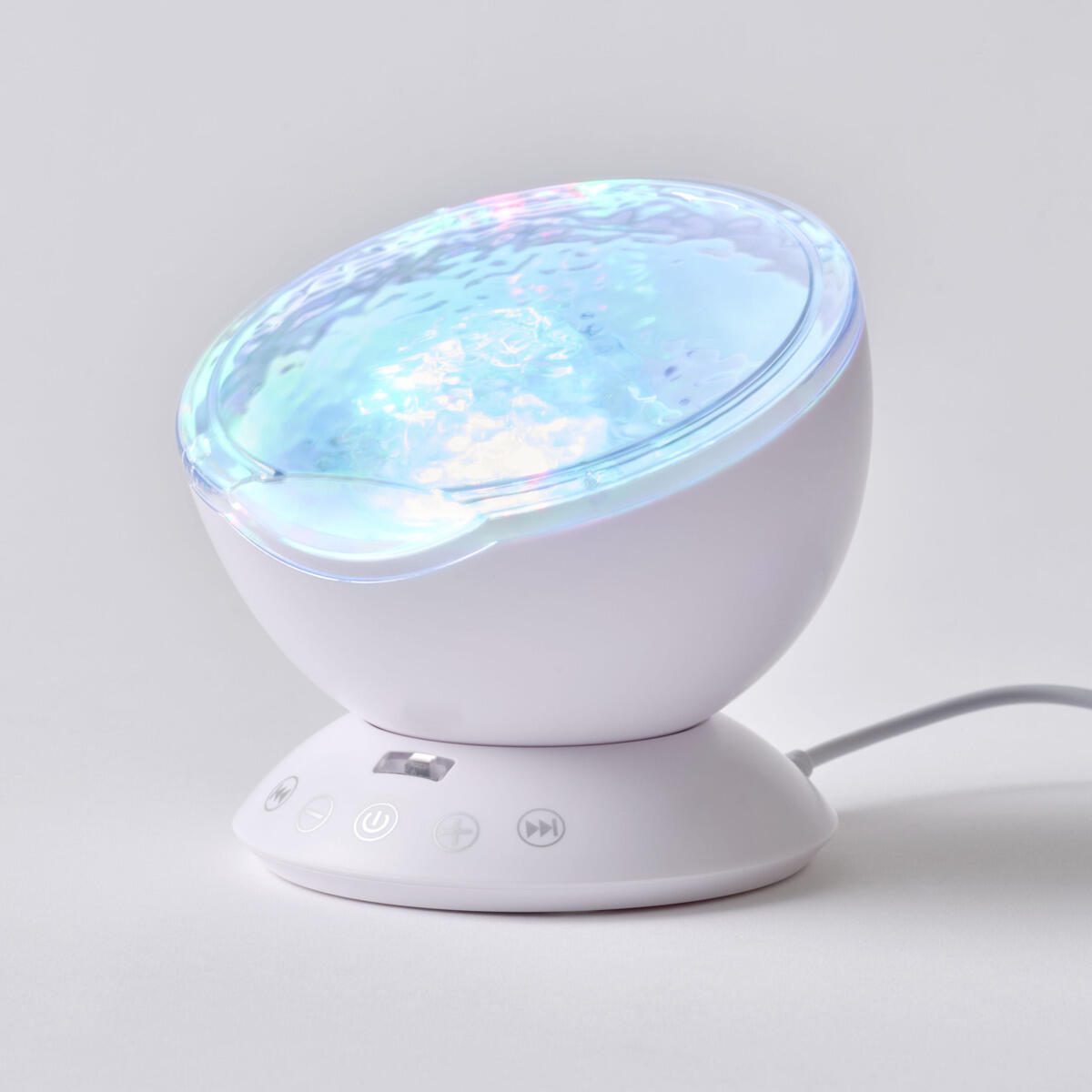 Denne lille projektor lyser rummet op i fantastiske farver, så det ligner havets bølger. Den har højttalere og kan kobles til en mobiltelefon, computer og tablet eller afspille musikfiler fra et TF-kort. Oplades via USB. Mål: 12,6x12,6x10,5 cm.