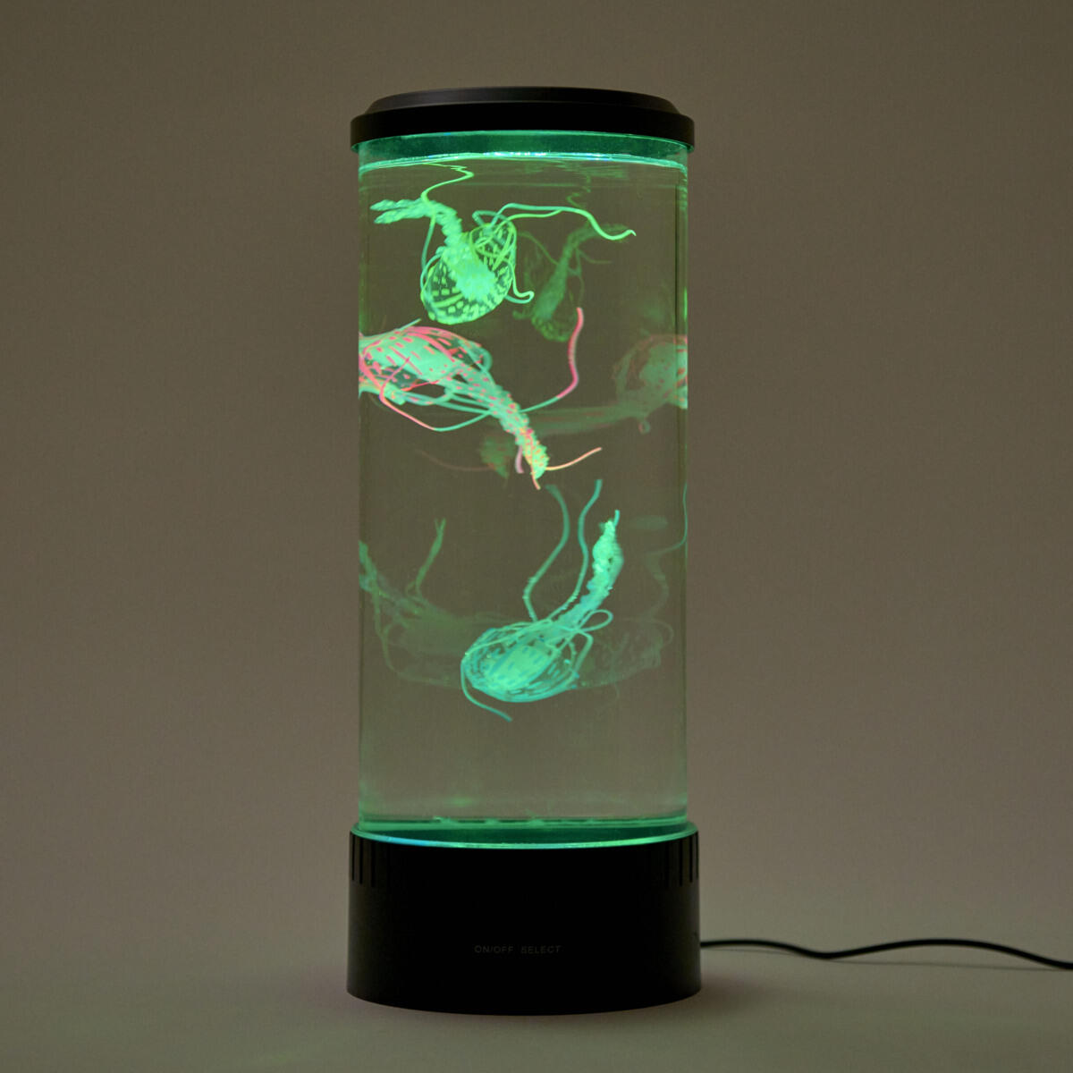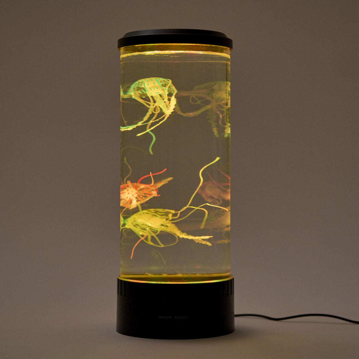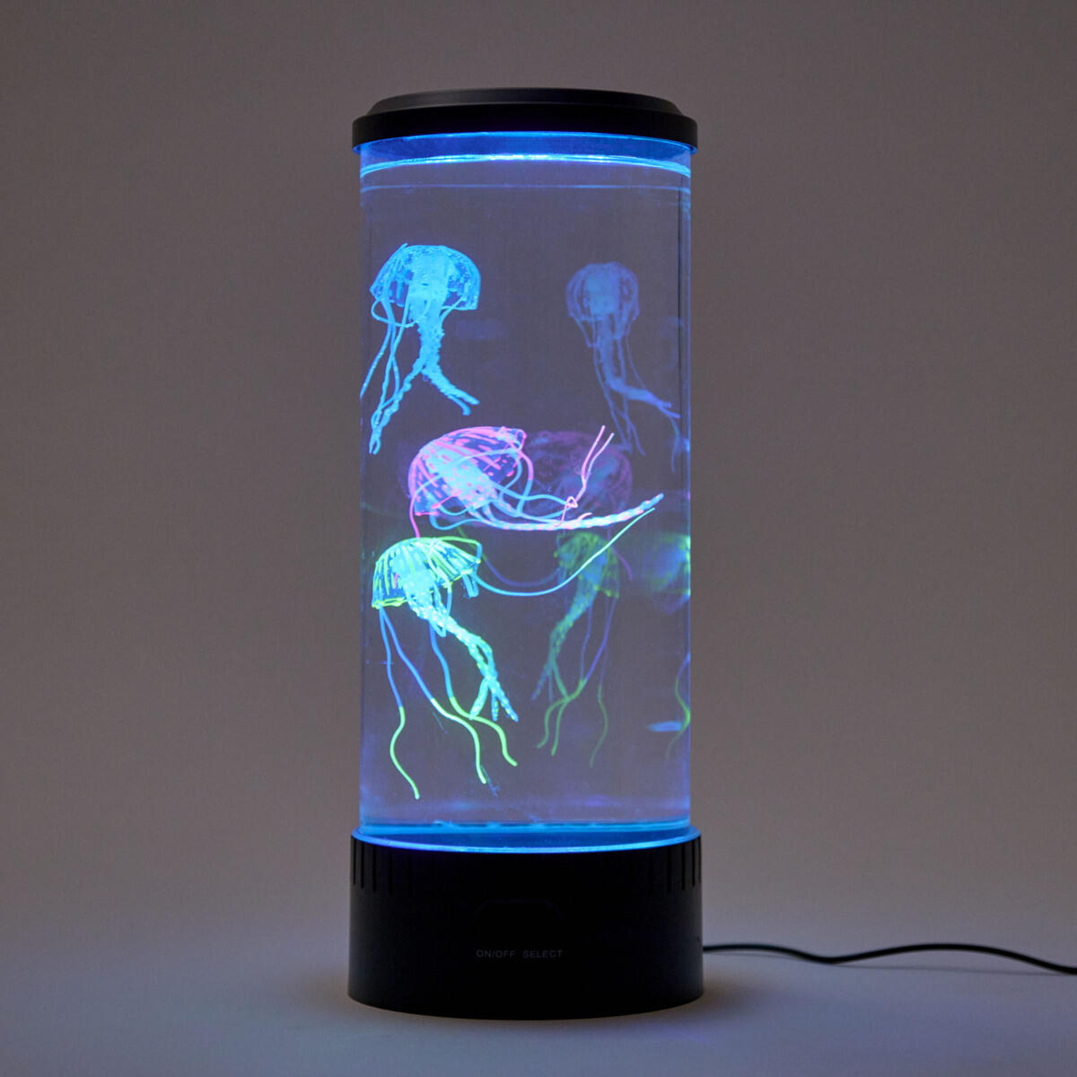 Et oplyst akvarium med gopler. Der er forskellige lysalternativer: at have én farve eller et lysshow med 6 forskellige farver. De kunstige gopler bevæger sig på en naturlig og realistisk måde. Luftpumpen blæser luft i vandet, som får goplerne til at bevæge sig. LED-pærer. Slukker automatisk efter 4 timer. Mål: 15x35 cm.