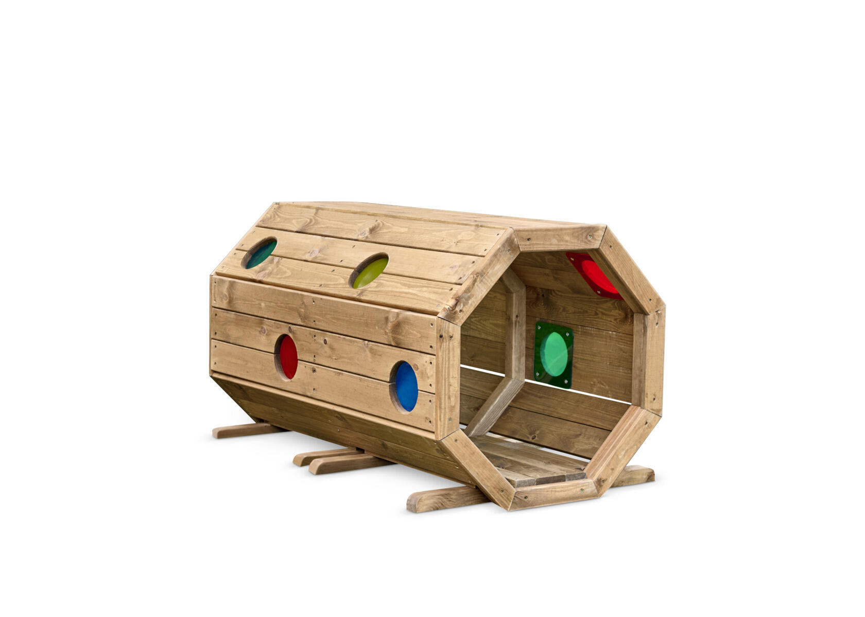 En eventyrlig tunnel, der indbyder til bevægelse, gemmeleg og fantasifuld rolleleg i uderummet. Tunnellen understøtter udviklingen af balance, koordination og grovmotorik, mens børn udforsker den med kroppen. De runde vinduer i farvet plexiglas slipper lys og farver ind og skaber stærke sanseoplevelser, der stimulerer det visuelle sanseapparat.