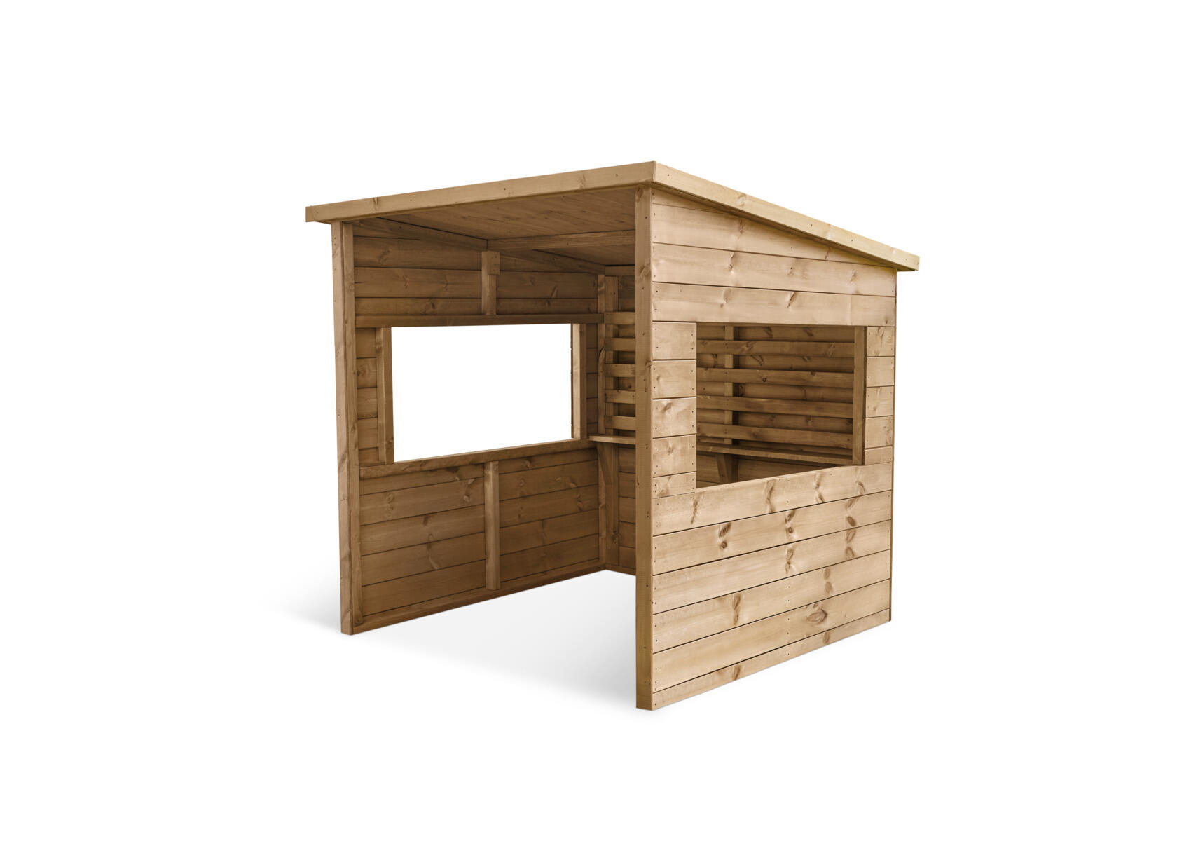 Skab et inspirerende og lærerigt udemiljø i børnehaven med dette alsidige legehus. Det lille hus har et åbent design til forskellige former for udforskning og rolleleg som butik, restaurant eller café, som stimulerer børnenes fantasi og kreativitet. Legehuset er udstyret med en smal disk, 2 store vinduer og en bagvæg med mulighed for at hænge ting op. Med den ene side helt åben kan både børn og pædagoger have overblik over, hvad der sker. Fremstillet af FSC-certificeret fyrretræ, som er overfladebehandlet med vandbaseret lak. Løsning til forankring sælges separat; til vægforankring kræves 2 stk art.nr. 151133, eller til jordforankring kræves 4 stk art.nr. 161297. Mål: H160 cm x B160 cm x D154 cm. Leveres usamlet.