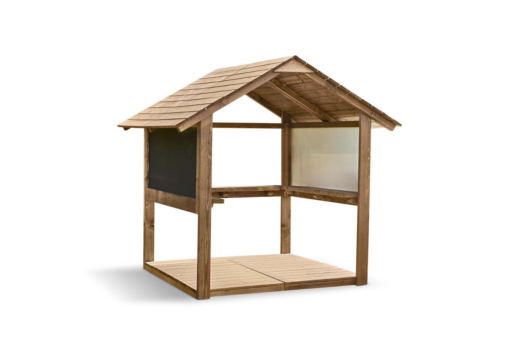 Skab en kreativ verden, der giver de bedste forudsætninger for at kunne skabe sammen i udemiljøet. Det lille hus har 3 forskellige skrive- og tegneflader, og børnene kan vælge mellem plexiglas, tavle og whiteboard. Huset er udstyret med hylder foran staffelierne til praktisk opbevaring. Taget beskytter mod både regn og stærk sol. Det er muligt at male direkte på plexiglasset og whiteboardet – husk blot at bruge aftørringsbar maling eller penne. På tavlen fungerer tavlekridt bedst. Fremstillet af FSC-certificeret fyrretræ, som er overfladebehandlet med en oliebaseret lak. Til jordforankring kræves 4 stk af 161297, eller 151133 til overflademontering. Leveres usamlet.