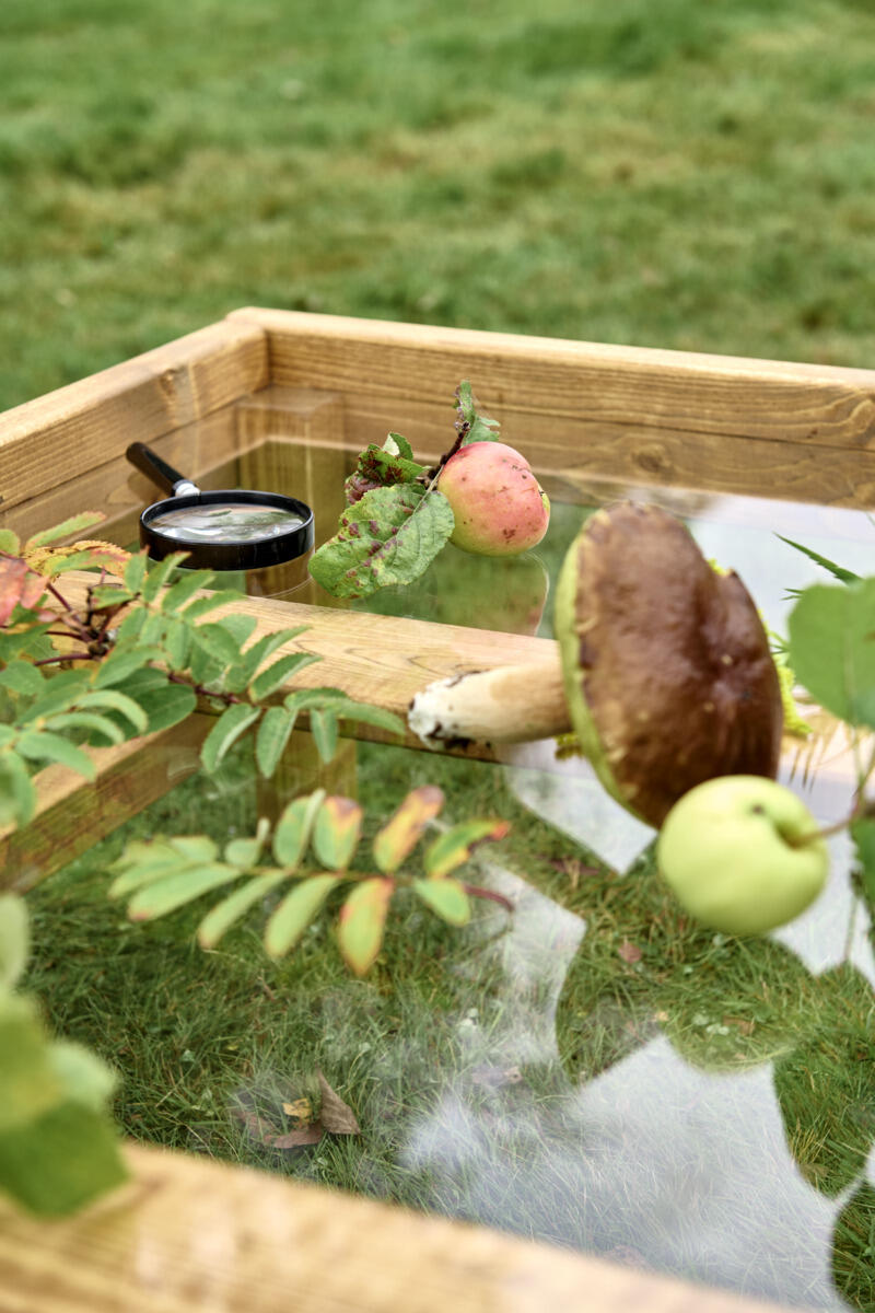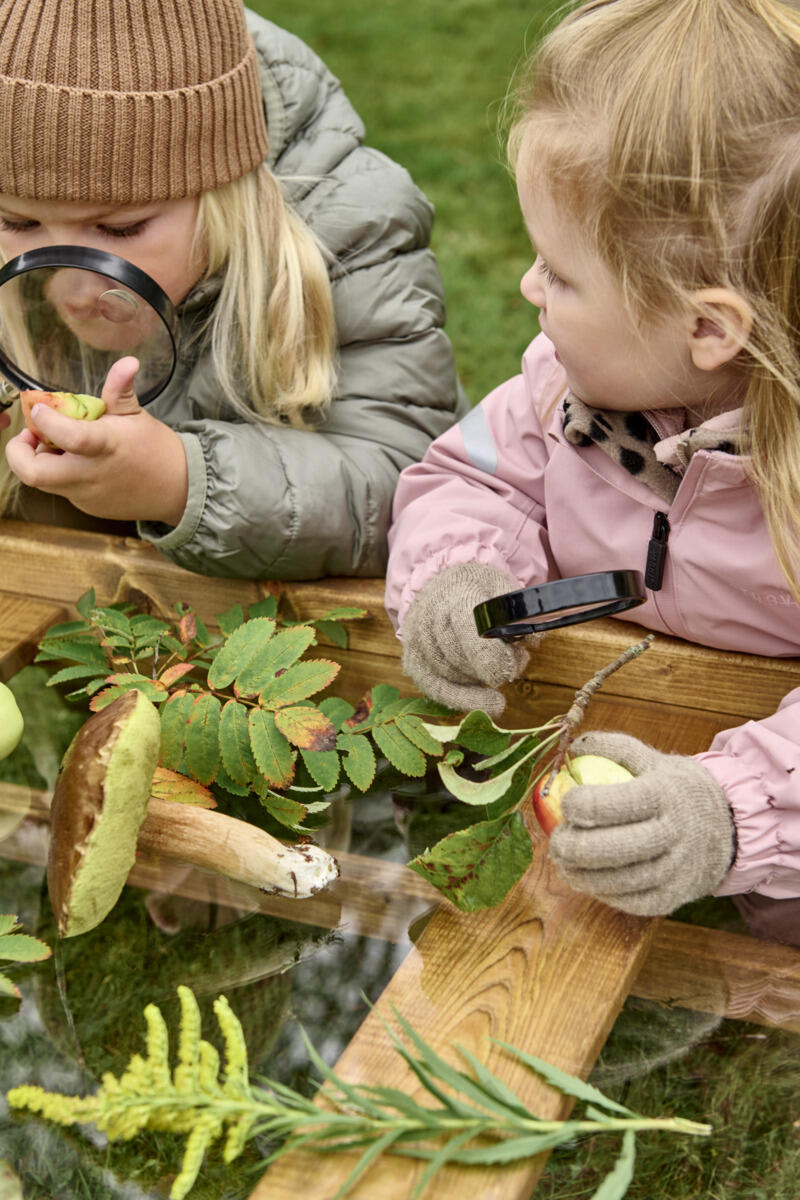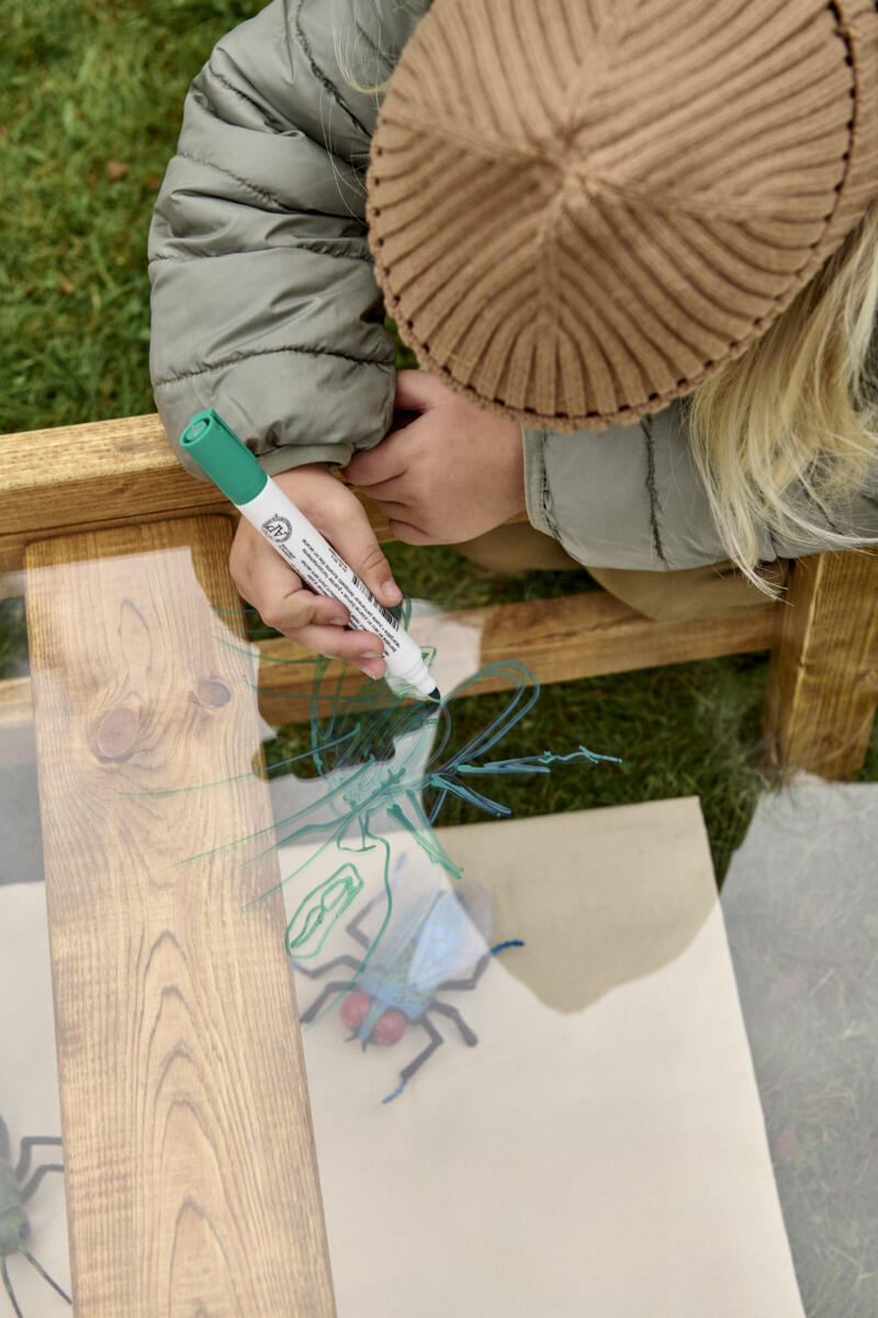 Vores atelierbord inviterer børn til at udforske, skabe og samarbejde i uderummet. Bordpladen i klart plexiglas giver en rummelig flade, hvor flere børn kan lege, tegne og lære sammen. Her kan der tegnes direkte på overfladen med aftørringsbare farver eller eksperimenteres med naturmaterialer som blade, sand og kogler.