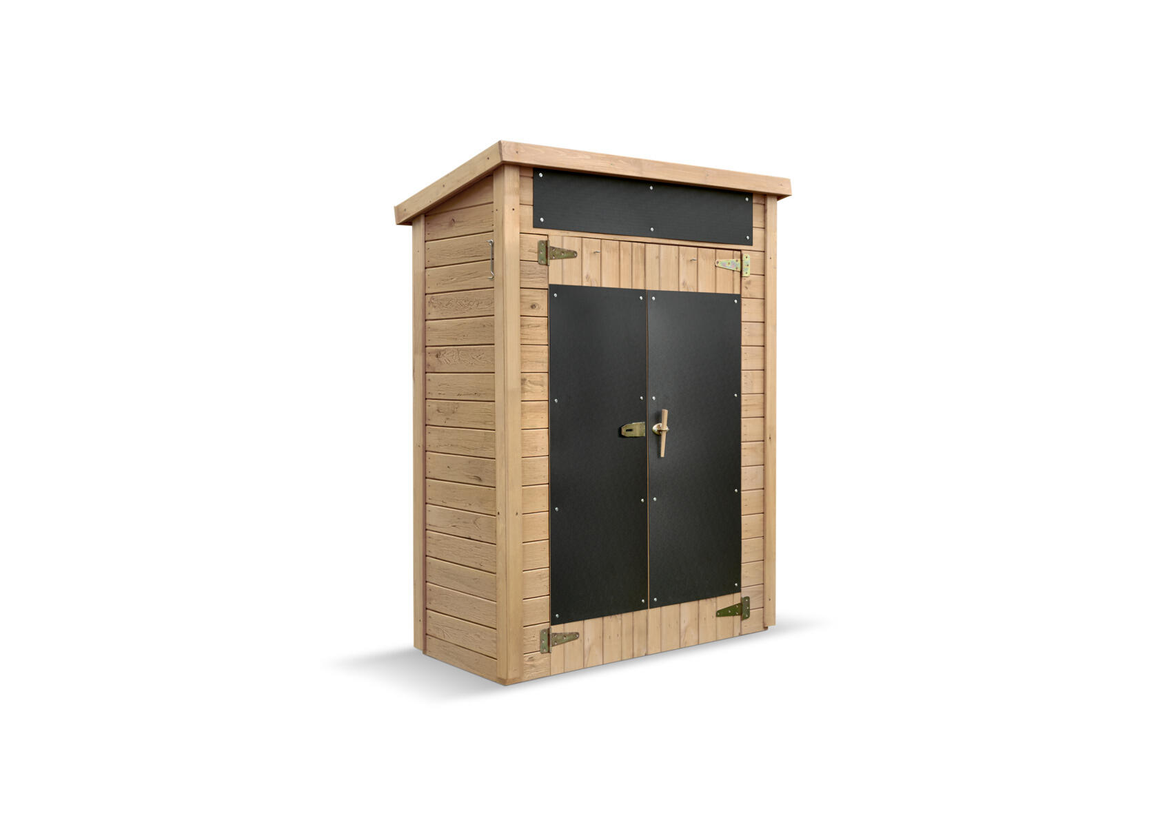 Forankringsløsninger sælges separat: til vægforankring kræves 2 stk. varenummer 151133, og til jordforankring kræves 4 stk. varenummer 151134. Skabet leveres samlet – kun taget skal monteres. Fremstillet af FSC-certificeret fyrretræ.