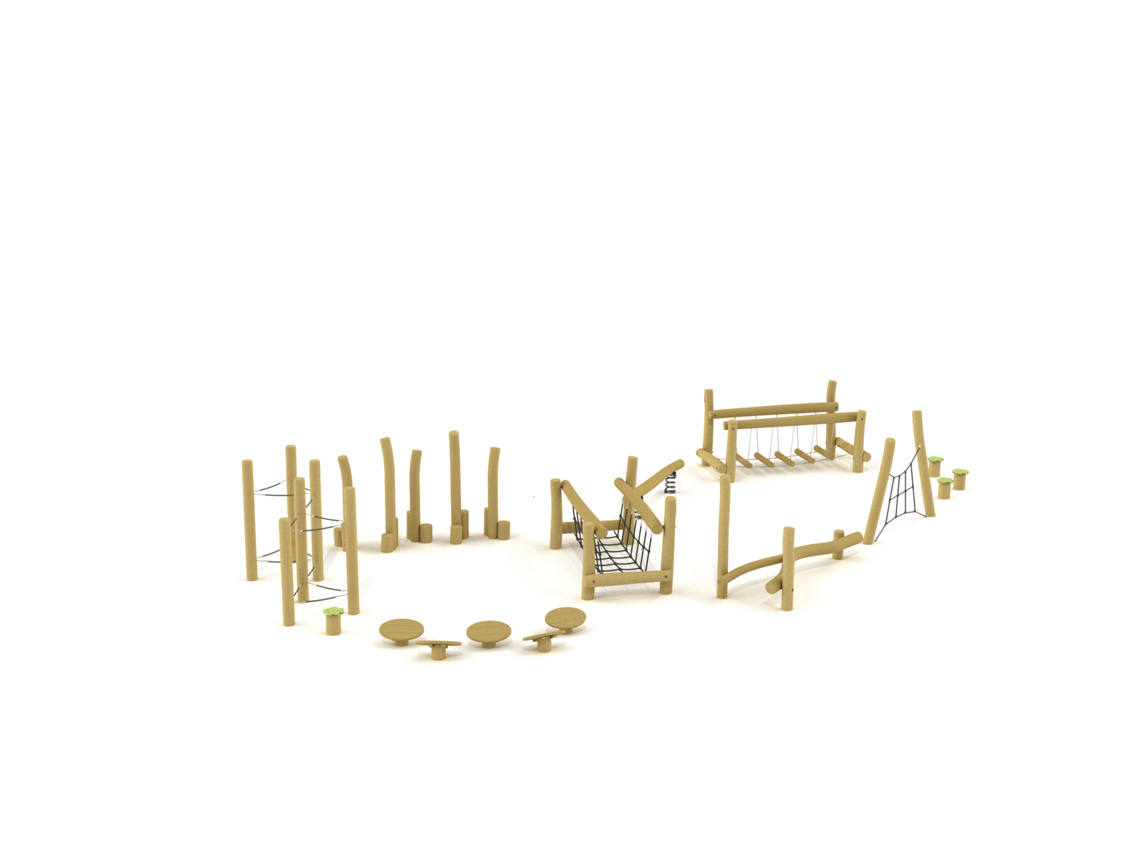 Robinie har et blødt og naturligt udtryk og falder smukt ind i uderummet. Når børnene bevæger sig gennem den store forhindringsbane, udfordres deres balance, koordination og kropsbevidsthed. Balancestubbene snor sig gennem en balanceskov, et klatrenet, en fjedrende balancebom, et Y-formet balanceelement, en rebskov, en klatrebro, en svajende stammebro og skråtstillede balanceelementer. Fremstillet af FSC-certificeret robinietræ – en træsort med høj modstandsdygtighed over for vejrpåvirkning. Træet absorberer kun minimalt med vand og er kendt for sin ekstremt lange holdbarhed. Monteres i henhold til montagevejledningen.