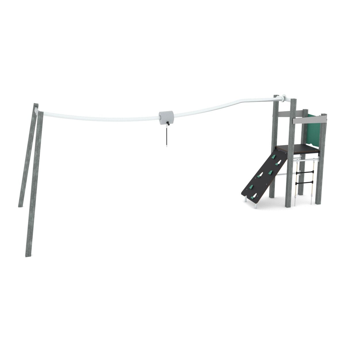 Svævebane med platform, der indviterer til sjov leg i uderummet. At turde suse afsted i fuld fart bliver en spændende oplevelse og giver en fantastisk følelse. Konstruktionen er baseret på genanvendt materiale, hvor alle stolper er fremstillet af genanvendt tekstil. Blandt fordelene ved dette materiale er, at det ikke ruster, ikke absorberer vand, er UV-resistent og samtidig lige så holdbart som stål. Kernen i alle paneler består af genanvendte reb og fiskenet. Stålkonstruktionen er fremstillet af galvaniseret og pulverlakeret stål. Monteres i henhold til installationsvejledning. Ved installation skal den medfølgende manual altid følges. Den nyeste version kan rekvireres på forespørgsel.