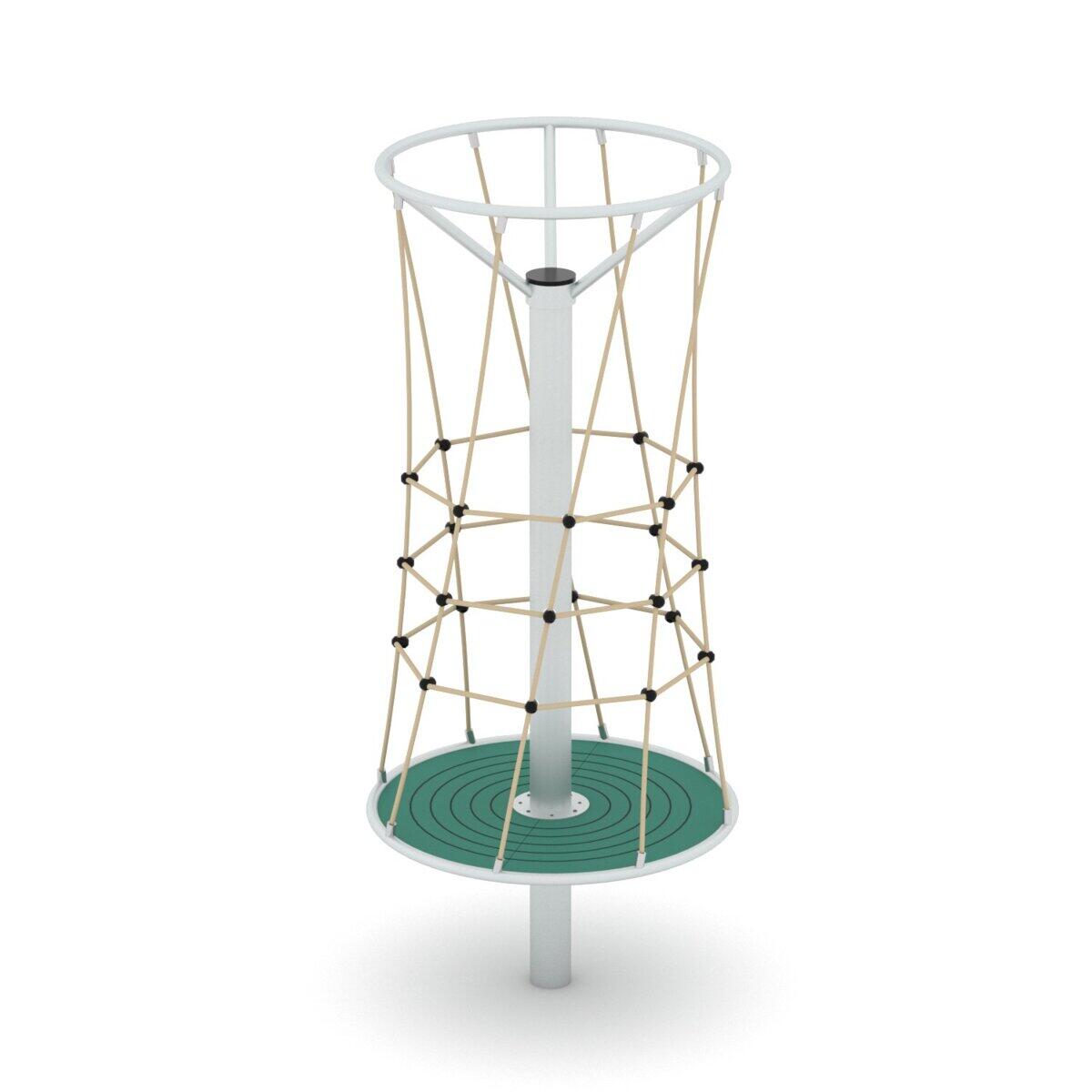 Karusel hvor børn lærer, at rotationshastigheden øges, når de bevæger sig tættere på midten. Aktiviteten træner både muskler, balance og koordination. Konstruktion i galvaniseret og pulverlakeret stål med skridsikker og vandafvisende HPL-bundplade. Panelernes kerne består af genanvendte reb og fiskenet, som bidrager til legepladser med lavere CO₂-udledning. Ved installation skal den medfølgende manual altid følges. Den nyeste version er tilgængelig på forespørgsel. K3 forankring medfølger som standard.
