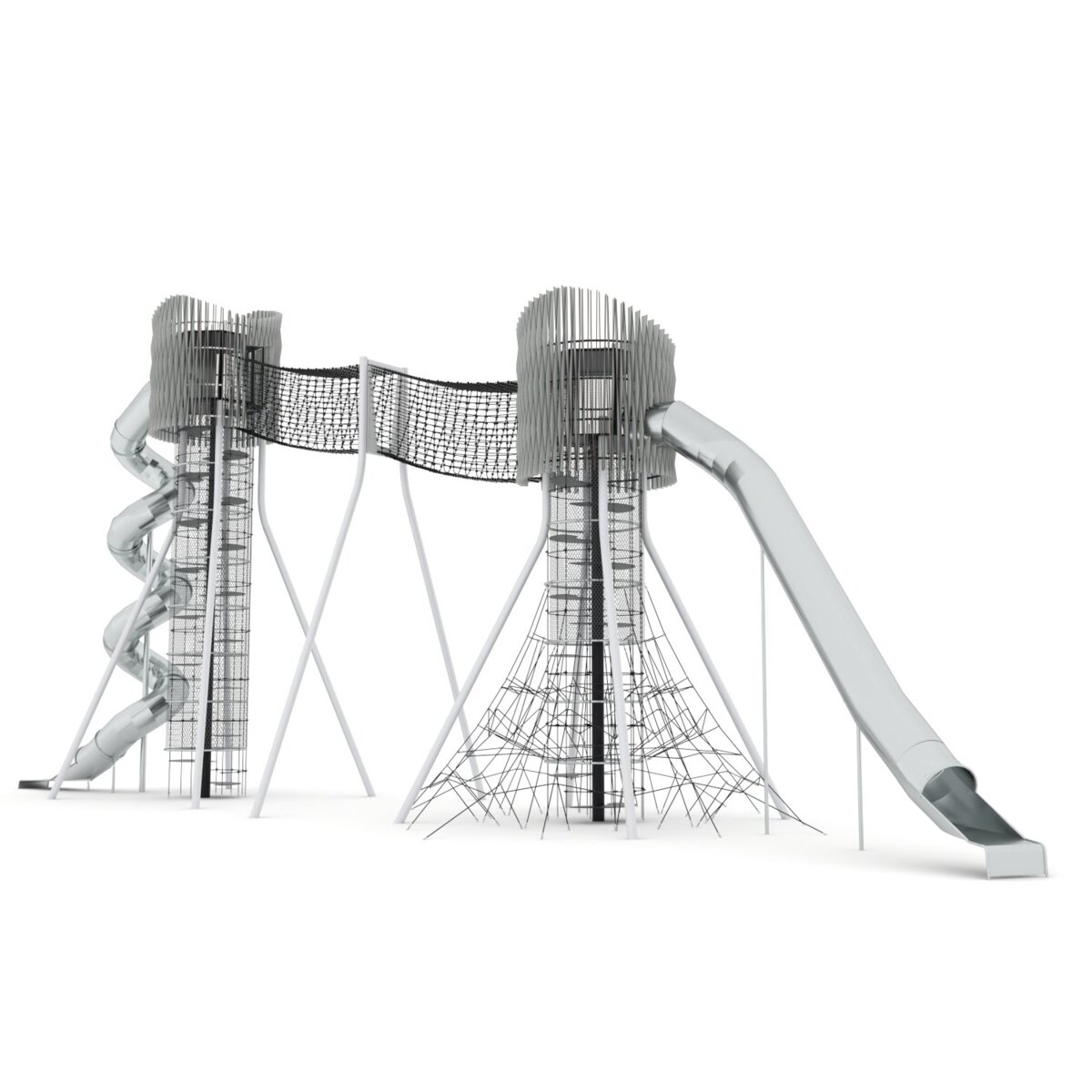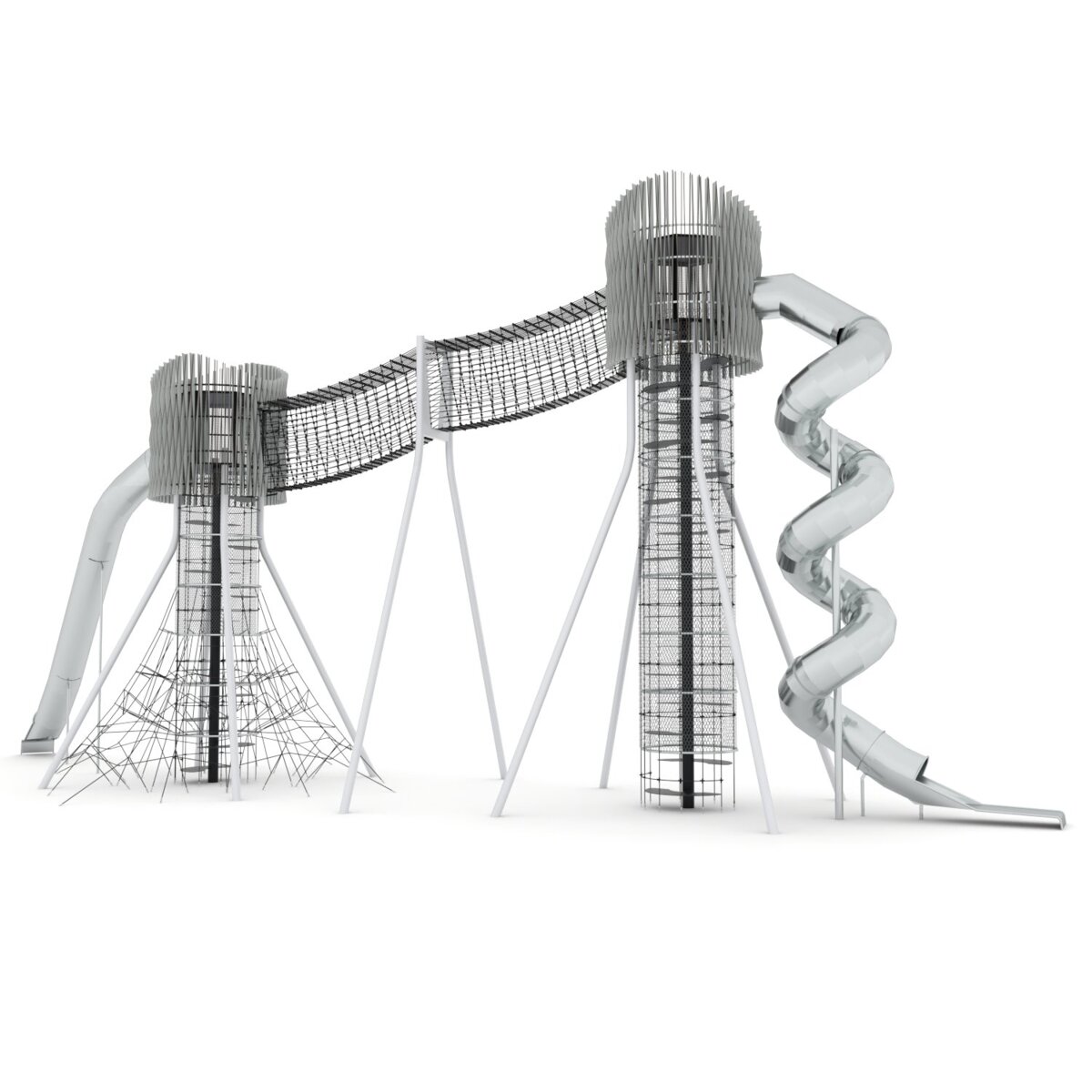 At klatre højt i tårne, der næsten når op til himlen, er både spændende og udfordrende. Ved at klatre udvikler børn deres motorik, koordination, balance og kropsbevidsthed. MAXX er et modulært system af højeste kvalitet. Denne model består af to høje tårne, klatrenet, spiraltrappetrin, hængebro mellem tårnene og en lang spiraltunnelrutsjebane samt en tuberutsjebane. Modulerne er lavet af varmgalvaniseret stål. Ved installation skal den medfølgende manual altid følges. Den nyeste version kan rekvireres på forespørgsel.