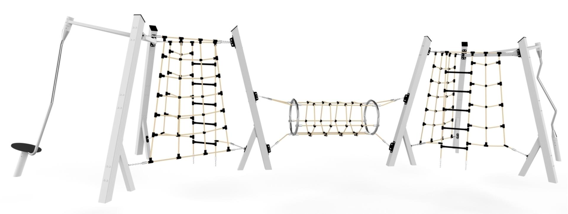 Stor klatrebane med mange forskellige klatreaktiviteter i pulvergalvaniseret og pulverlakeret stål. Platform i HDPE med skridsikker beskyttelse og reb i rustfrit stål beklædt med polypropylen. Alle potentielt skarpe overflader er dækket af gummi- eller plastpropper for at minimere risikoen for kvæstelser. Forankring til nedstøbning medfølger. Ved installation skal den medfølgende manual altid følges. Den nyeste version kan rekvireres på forespørgsel.