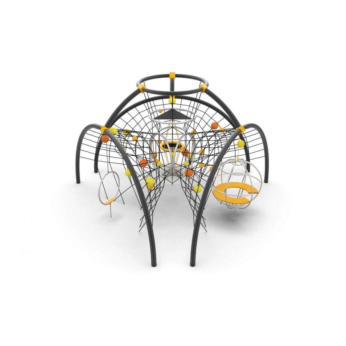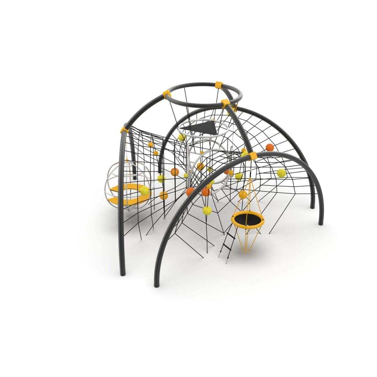 En imponerende klatrekuppel, der inviterer til bevægelse, leg og samarbejde. Med sine store buer i robust stålrør og net skabes en unik klatreoplevelse, som inspirerer børn til at udfordre sig selv igen og igen. Kuppelen tilbyder en kombination af klatring, balance og hvilesteder, hvilket gør den ideel til skolemiljøer og offentlige legepladser. Her trænes styrke, koordination og social interaktion på en naturlig måde. De åbne flader og varierede sværhedsgrader giver plads til både aktive klatrere og børn, der ønsker en pause og socialt samvær.