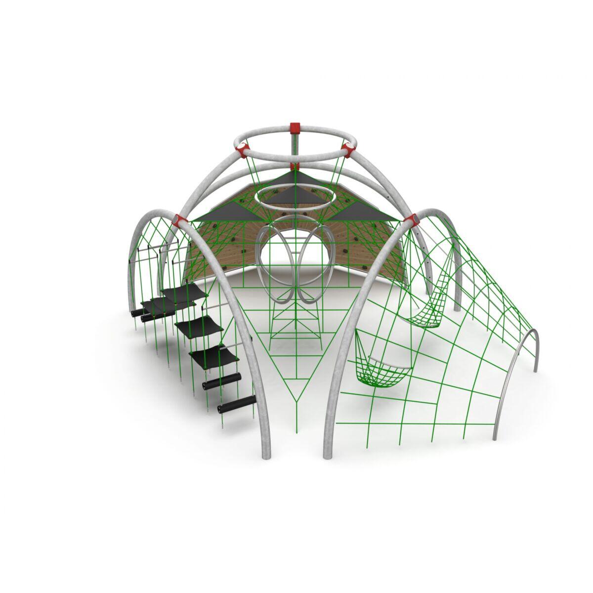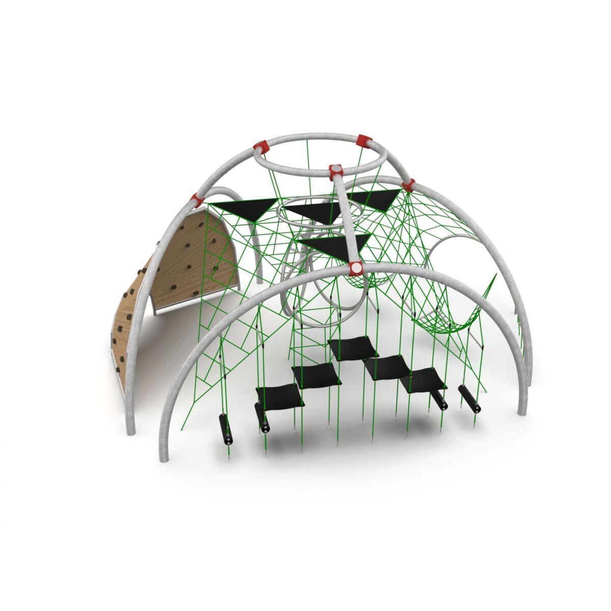 En imponerende klatrekuppel, der inviterer til bevægelse, leg og samarbejde. Med sine store buer i robust stålrør og net skabes en unik klatreoplevelse, som inspirerer børn til at udfordre sig selv igen og igen. Kuppelen tilbyder en kombination af klatring, balance og hvilesteder, hvilket gør den ideel til skolemiljøer og offentlige legepladser. Her trænes styrke, koordination og social interaktion på en naturlig måde. De åbne flader og varierede sværhedsgrader giver plads til både aktive klatrere og børn, der ønsker en pause og socialt samvær.