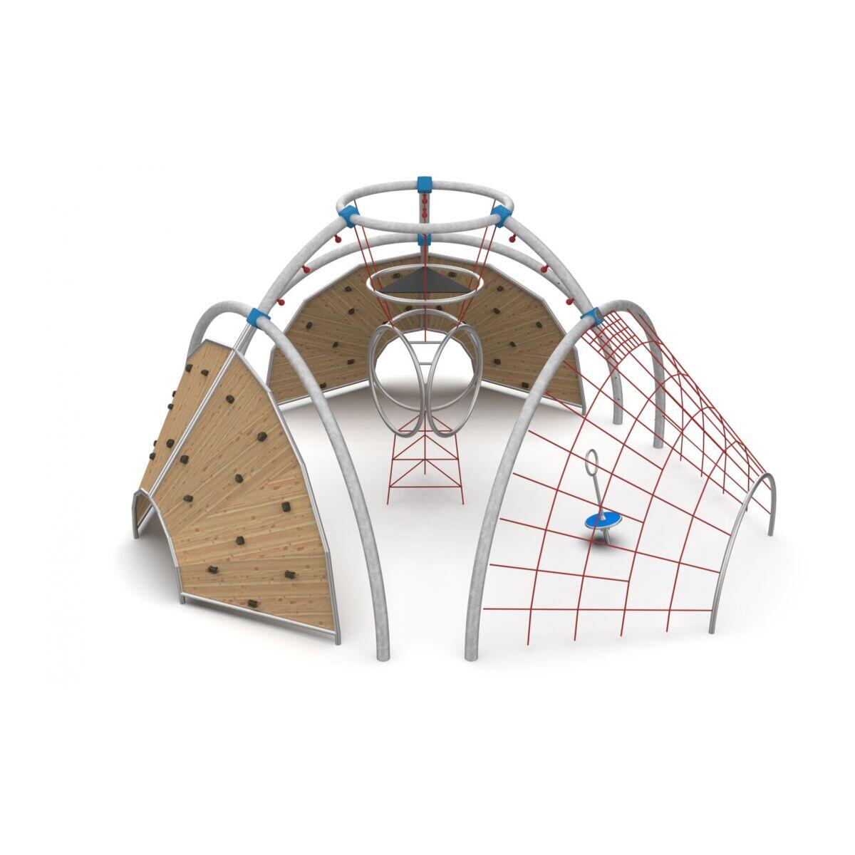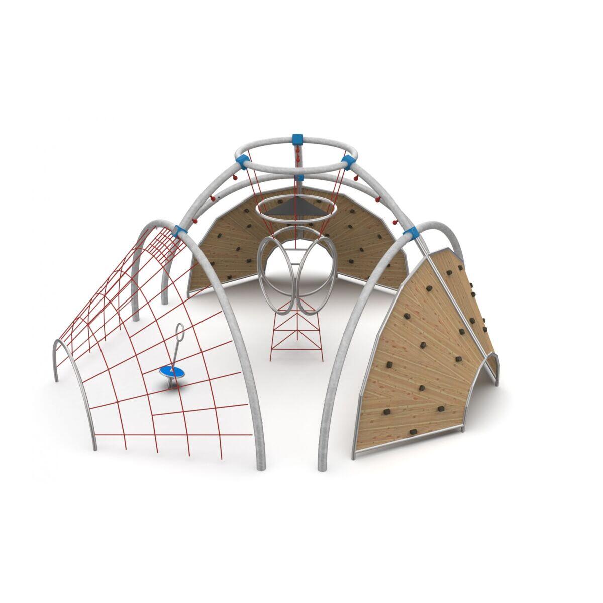 En spektakulær klatrekuppel, der bliver et naturligt samlingspunkt på enhver skolegård og legeplads. Den er designet til at inspirere og udfordre børn i skolealderen gennem en kombination af klatring, balance og sociale mødesteder. De store buer i kraftigt stålrør giver en robust og sikker konstruktion, og nettet skaber en smidig og unik klatreoplevelse. Kuppelen tilbyder flere niveauer og vinkler, som opmuntrer børn til at teste deres grænser, udvikle styrke og koordination samt samarbejde med hinanden.