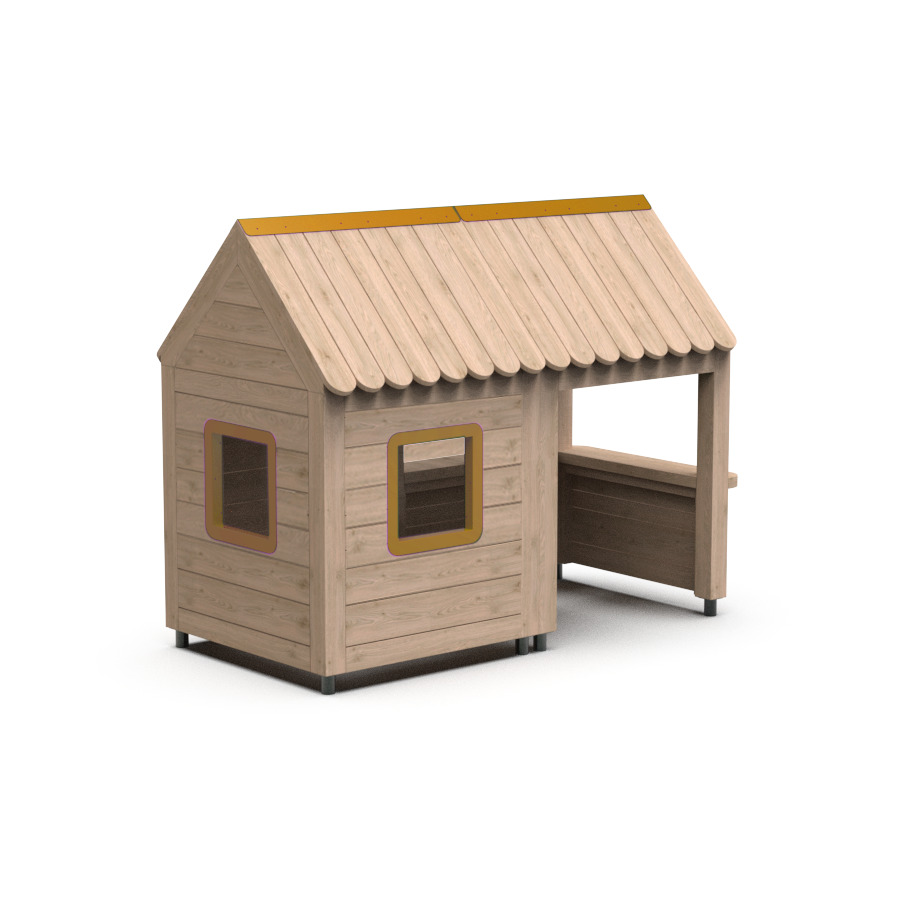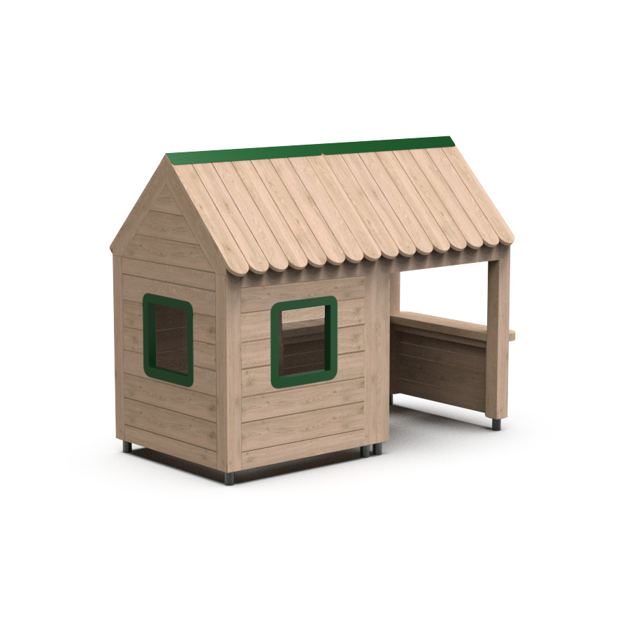 Et stort legehus, der tilskynder til fantasifuldt rollespil. Det lille vindue i gavlen og det store på den korte side gør, at legehuset fungerer lige så godt som kiosk eller butik. Nogle gange kan indtrykket blive for stort i udemiljøet og så kan det være rart at trække sig tilbage og bruge huset som et tilflugtssted. Legehuset er indrettet med bord og 2 bænke og har en fin lille veranda. Legehuset er fremstillet af massivt PEFC-certificeret fyrretræ. Mål: 190x160x196 cm. Leveres usamlet som knock-down.. Løsning til nedgravet jordforankring eller overflademontering vælges som tilvalg.