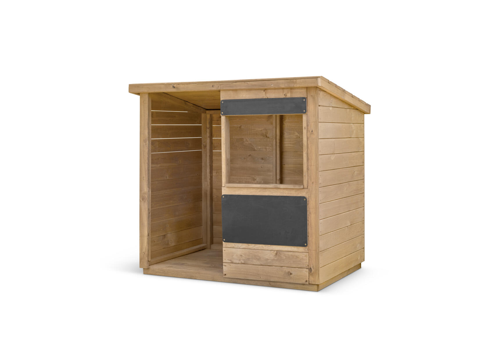 Et alsidigt hus, der beriger udemiljøet og inspirerer til uendelig fantasifuld leg. Det lille hus kan fungere både som butik, markedsbod, hjem eller et roligt lille hjørne. På forsiden er der et stort vindue, som kan fungere som disk, og huset er også udstyret med to tavler. Fremstillet af FSC-certificeret fyrretræ, som er overfladebehandlet med en vandbaseret lak. Til vægforankring kræves 2 stk art.nr. 151133, eller til jordforankring kræves 4 stk af 161297. Leveres umonteret.