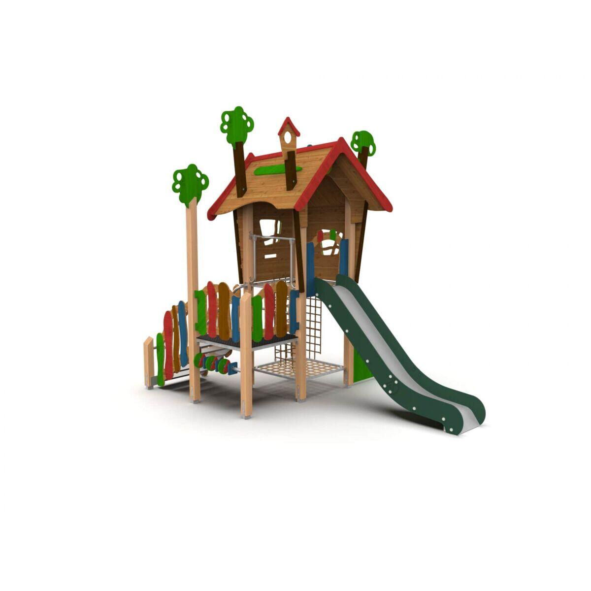 Titel: Trollskoven træhytte med klatrenet og rutsjebane