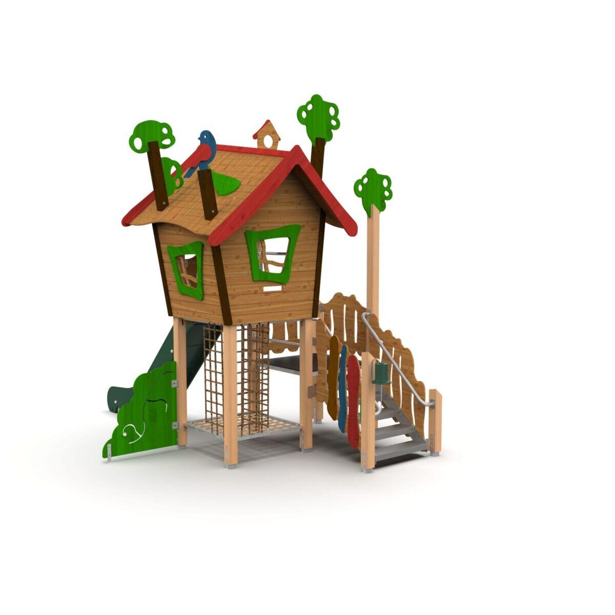 Trollskoven er et højt og eventyrinspireret legehus kombineret med forskellige elementer, der passer perfekt til børnehavens uderum. Ved trappen sidder en lille ”ringeklokke”, som gør legen endnu mere virkelighedstro. Fra legehuset kan børnene suse ned ad en dejlig rutsjebane. Under huset findes et lille markedsbodsområde med bænk. Legesystemet leveres stort set færdigmonteret for nem installation. Konstruktionen er robust og fremstillet af grundbehandlet og laseret fyrretræ med stolpesko af varmforzinket stål og trappetrin i riflet aluminium.