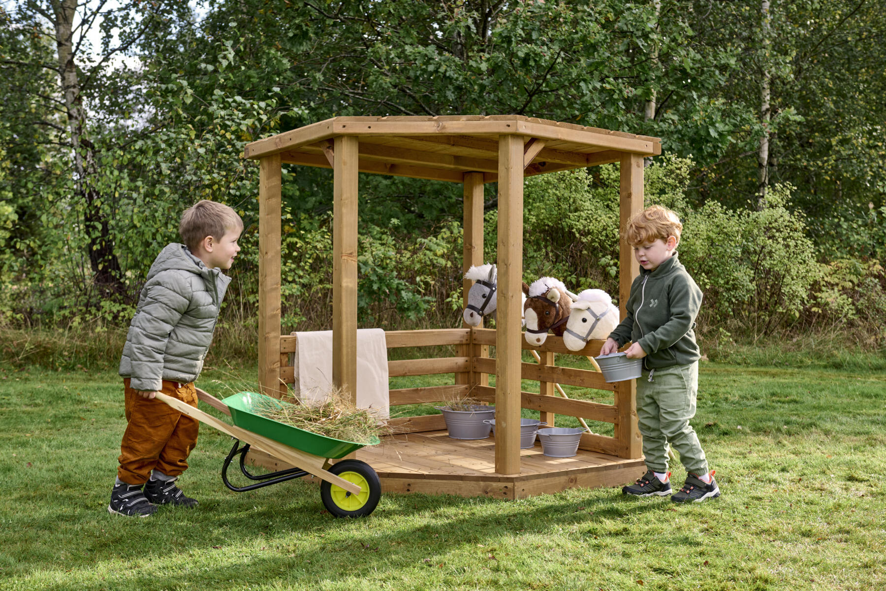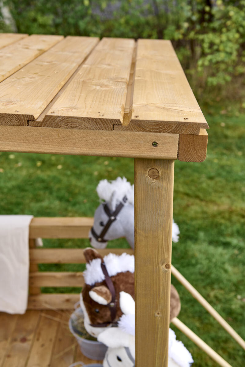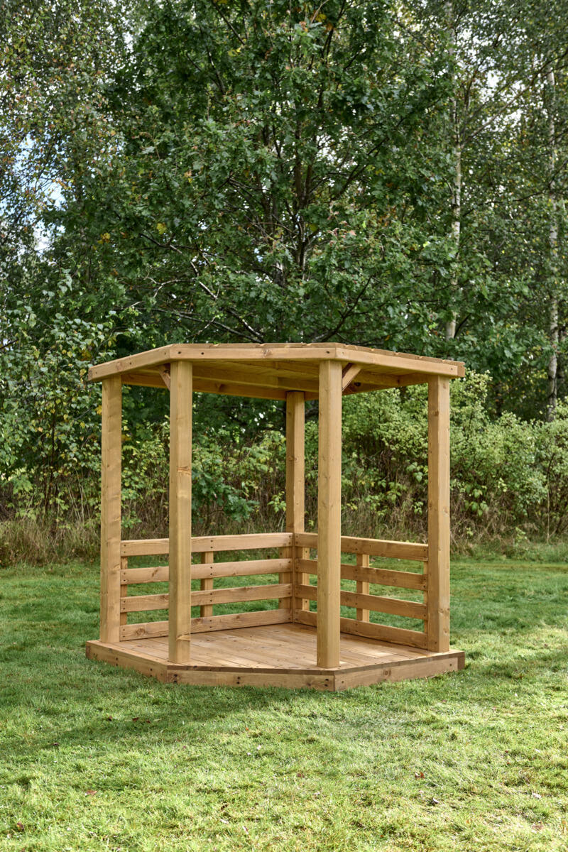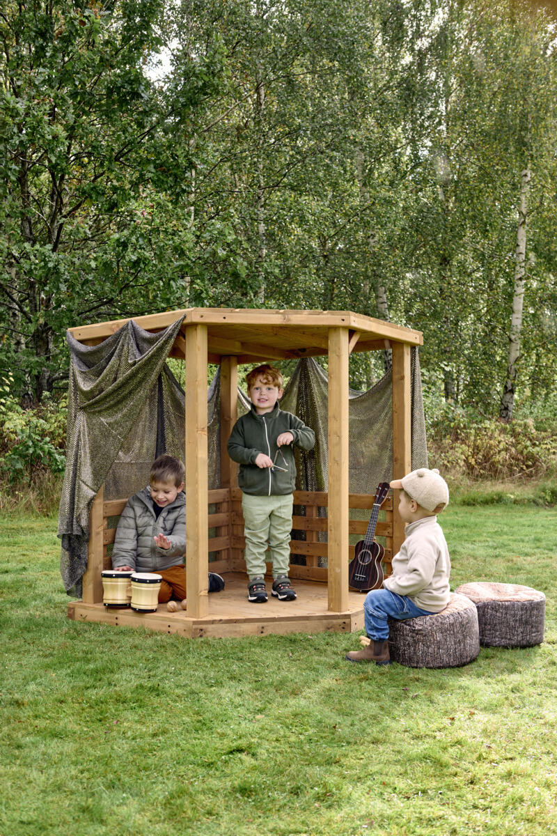 Scenens åbne design inviterer til drama, fortælling og fantasifuld rolleleg i uderummet. Perfekt for de mindste børn, som vil udtrykke sig, udforske og skabe med kroppen og stemmen. Med enkle justeringer kan scenen bruges på flere måder – som et hyggeligt gemmested, en teaterscene med gardiner eller et lille rum til fri rolleleg. Det skrånende tag giver læ og beskyttelse mod både sol og regn.