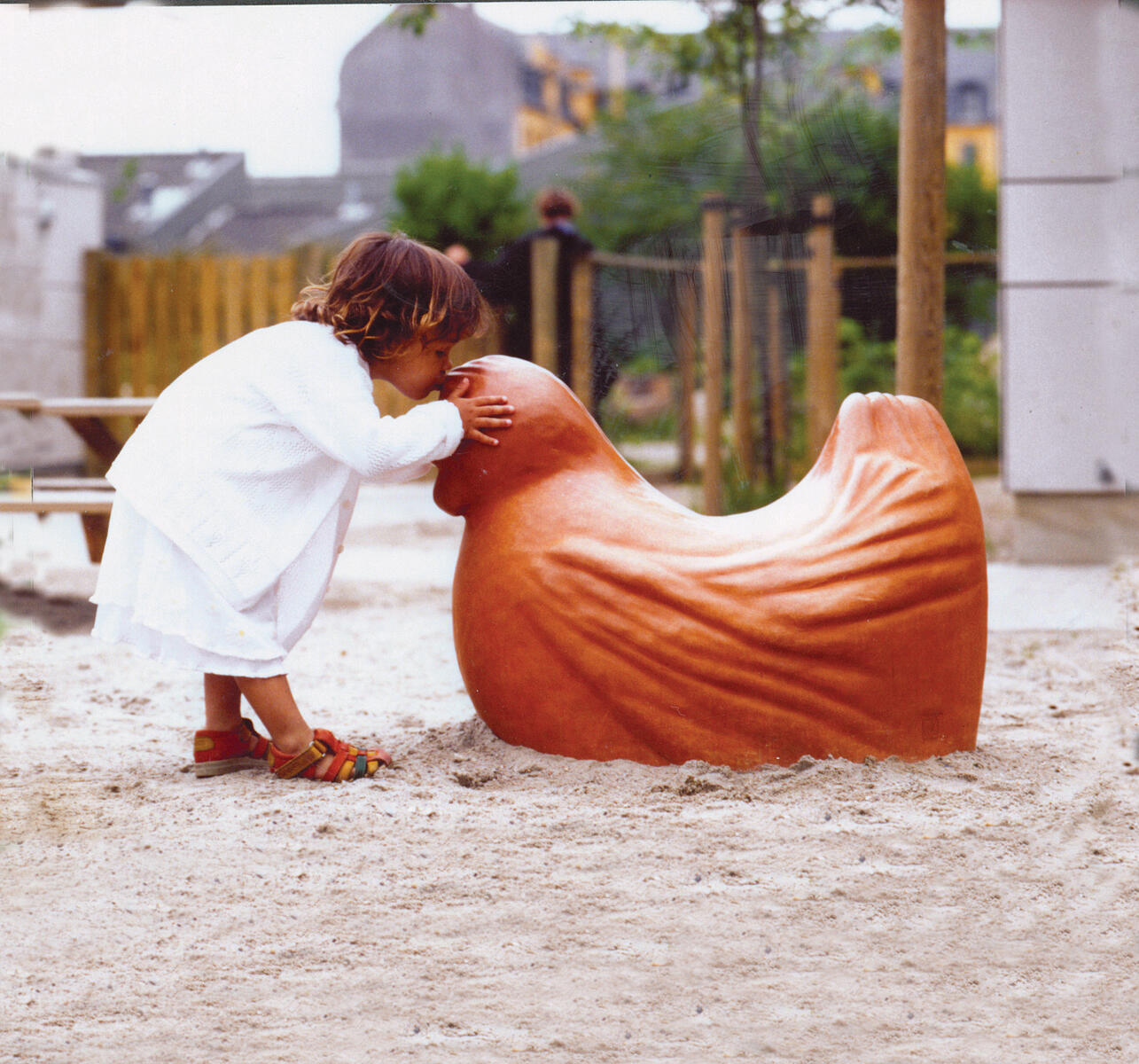 En smuk skulptur i bløde former, der både kan bruges som en attraktiv dekoration i offentlige udemiljøer og som samtidig inviterer til leg for børn og barnlige sjæle. Skulpturerne er lavet af naturmaterialer bestående af speciel beton blandet med knust granit. De gennemfarves og produceres i forskellige naturlige farver. Skulpturerne er designet af den danske designer Lissy Boesen. Jordforankring er påkrævet men medfølger ikke. Skulpturen er forberedt med to huller på undersiden, der passer til M12 gevindstang. Ved placering på eller i tilknytning til en legeplads anbefales et frirum på 1,5 m omkrign skulpturen. Ved placering af flere skulpturere samlet, max 40 cm imellem og 1,5 m til andre elementer.