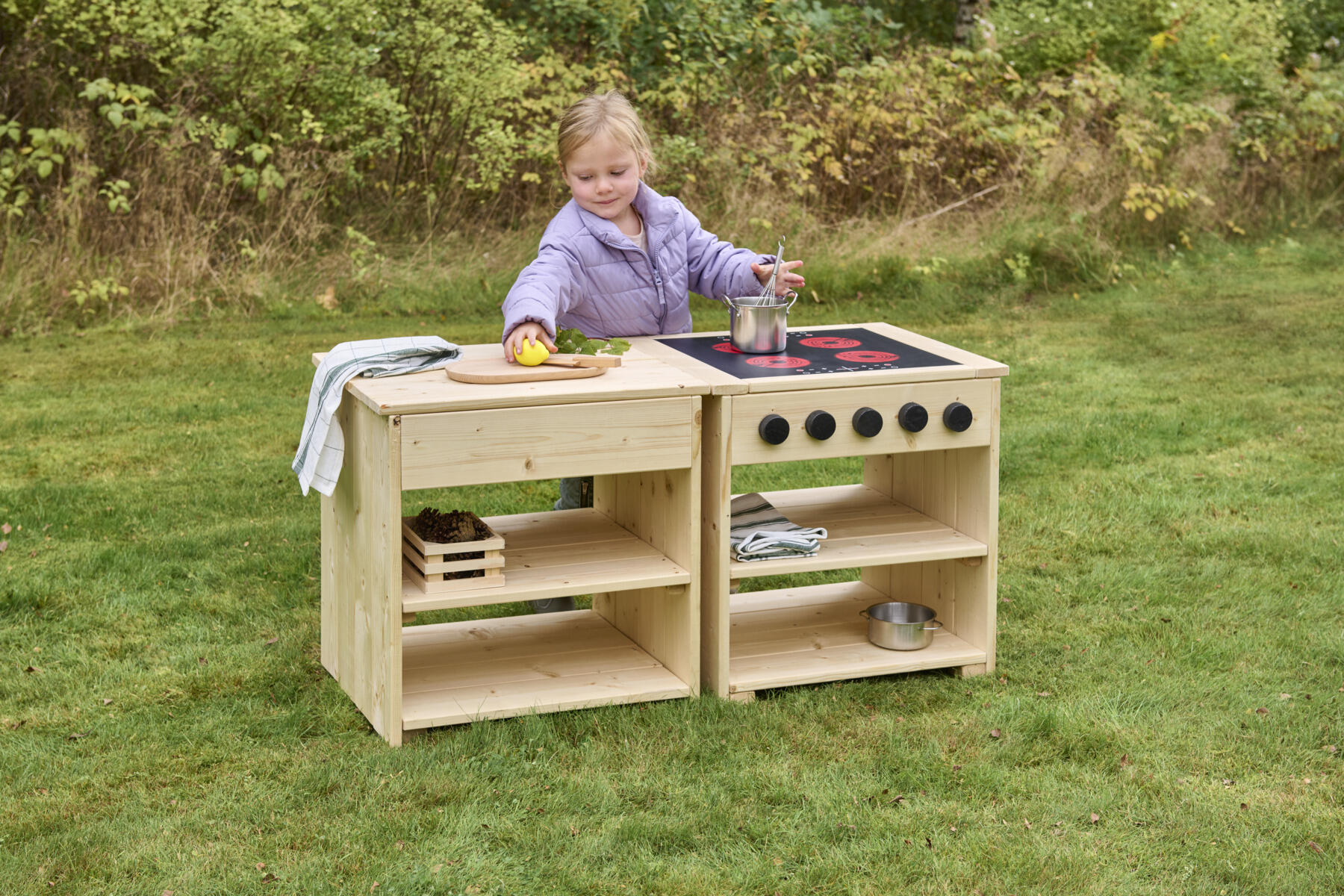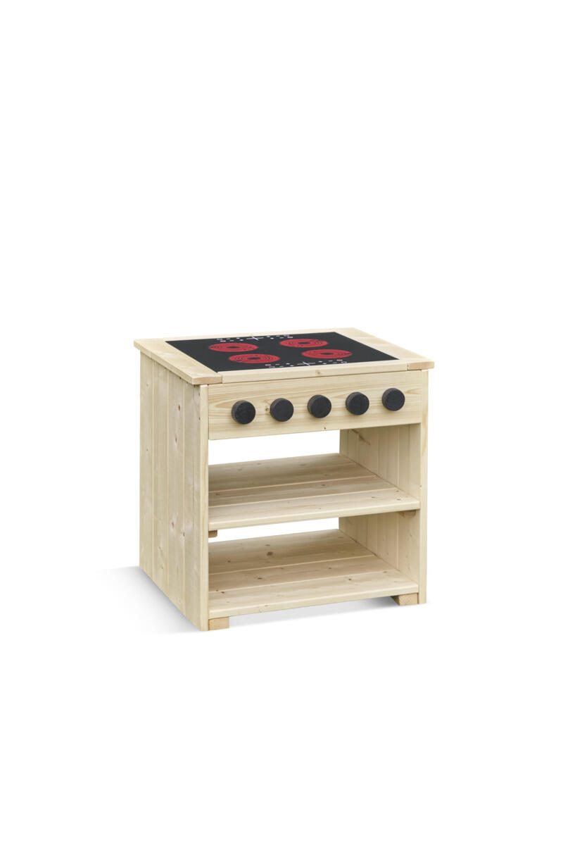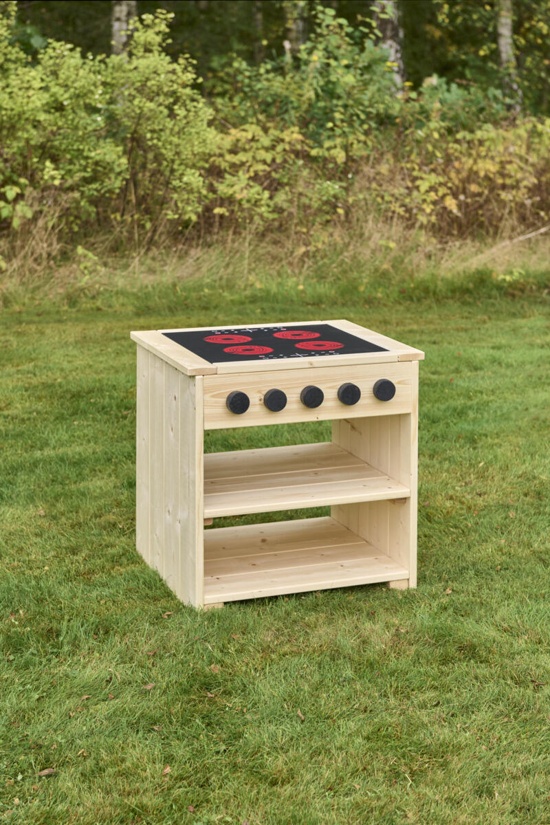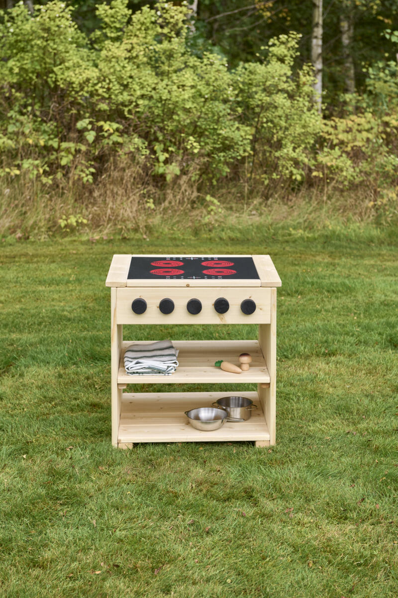 Induktionsplade, drejelige knapper og åbne hylder skaber en tydelig ramme for leg, samarbejde og fantasi.