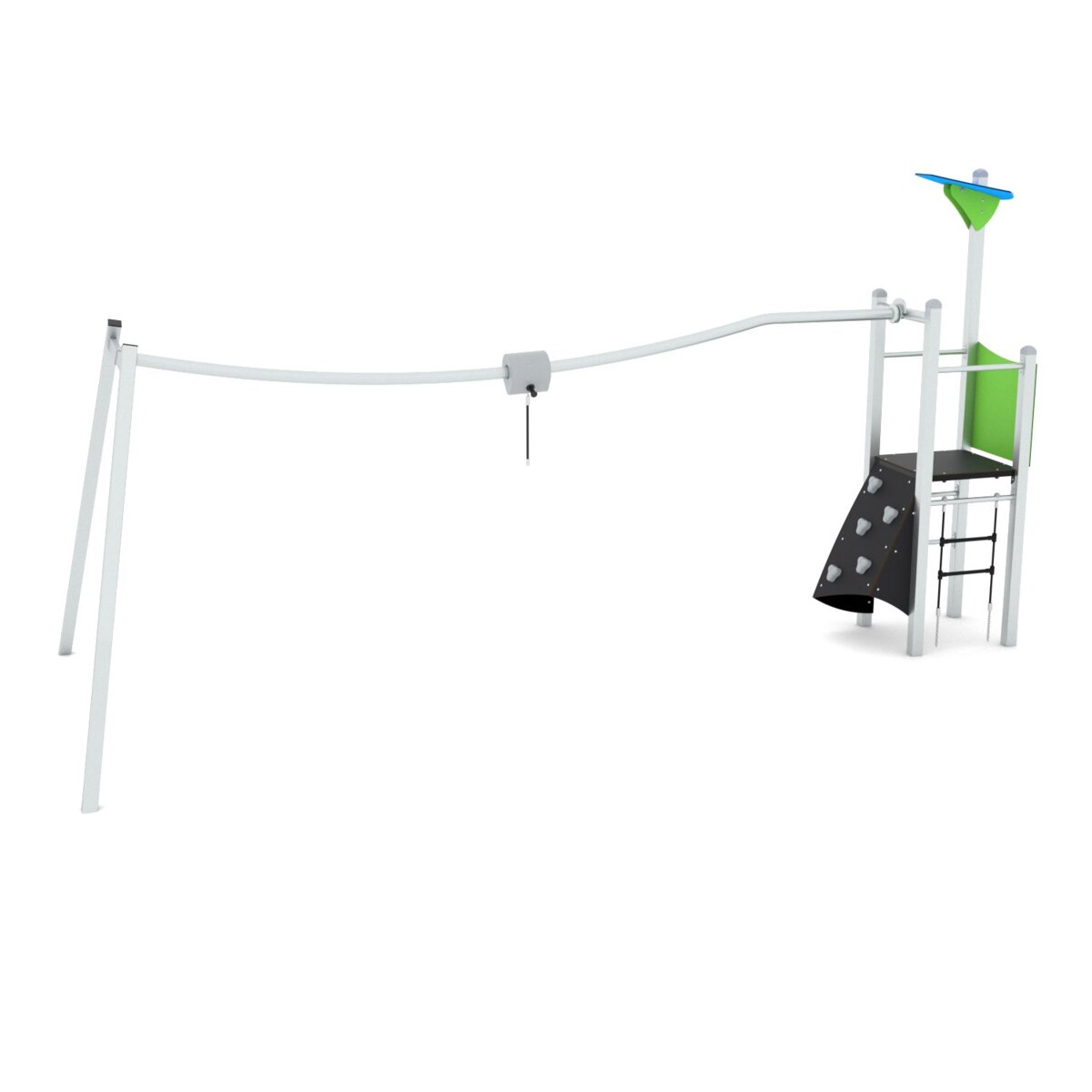 En svævebane med platform, der indbyder til sjov leg i uderummet. De 3 forskellige måder at komme op på platformen skaber variation, og det at turde suse afsted i fuld fart bliver en spændende oplevelse og giver en herlig følelse. Konstruktion af stål, imprægneret fyrretræ, skridsikker og vandtæt krydsfinér, HDPE/HPL. Monteres i henhold til installationsmanualen. Ved installation skal den medfølgende manual altid følges. Den nyeste version kan rekvireres på forespørgsel.
