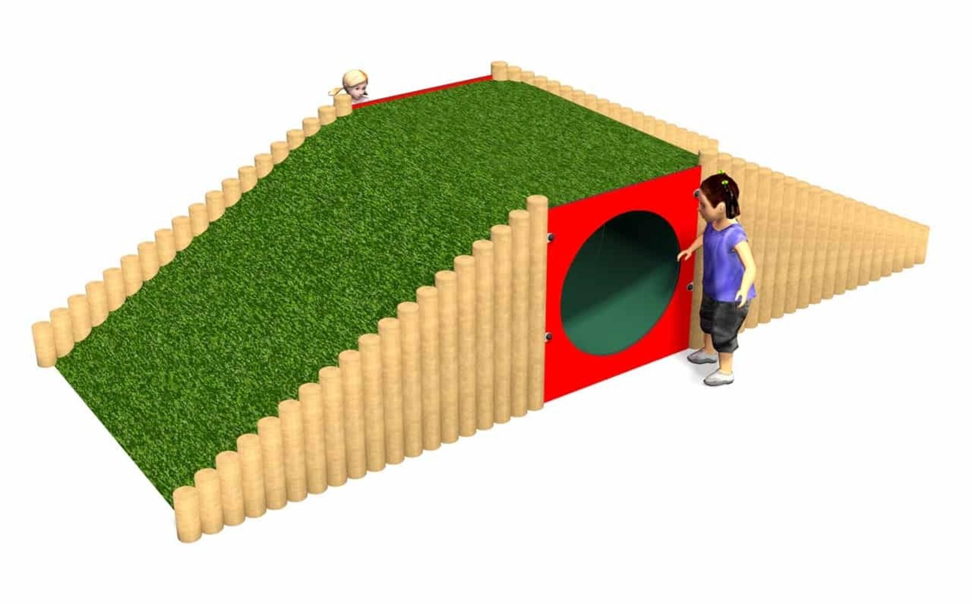 Børn udfordres motorisk og kan bruge tunnelen til gemmeleg, kravle igennem eller skabe deres egne historier. En robust kant af træstammer omkranser bakken og fremhæver niveauforskellen.