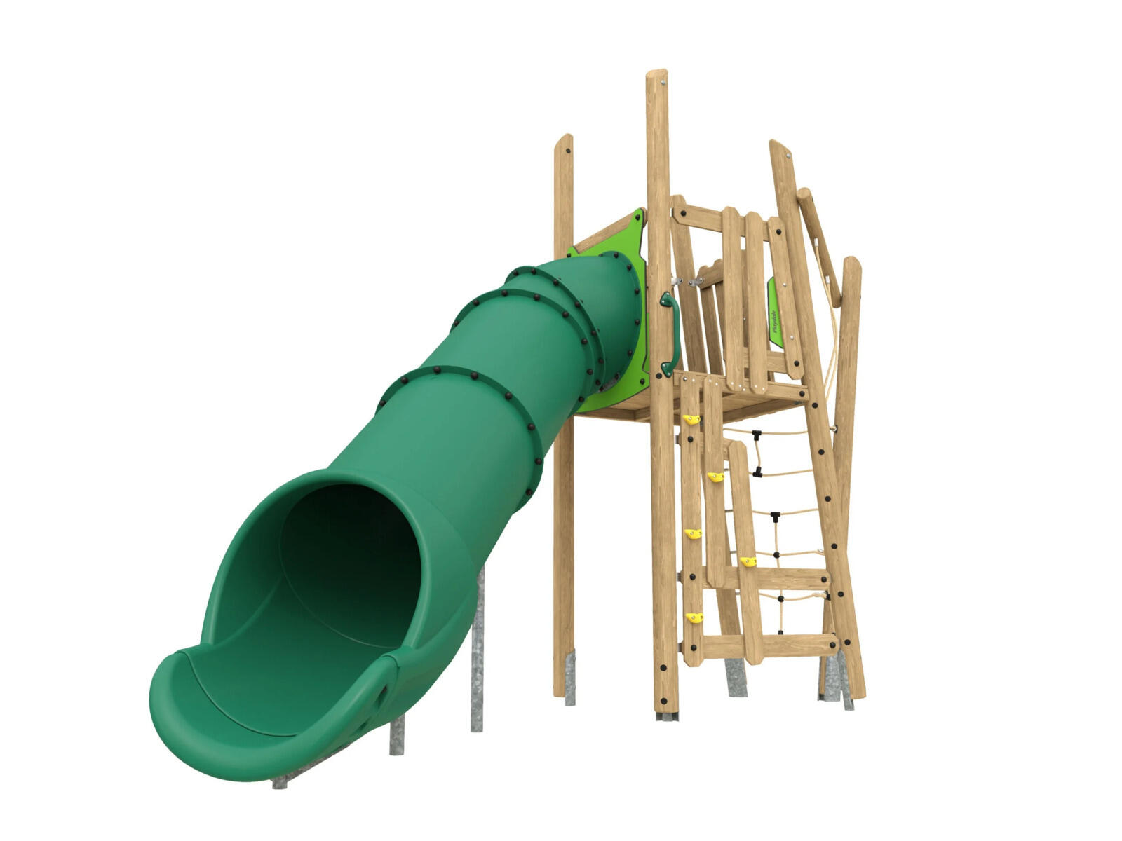 Det høje, skråtstillede tårn har en tunnelrutsjebane og flere spændende klatreelementer.