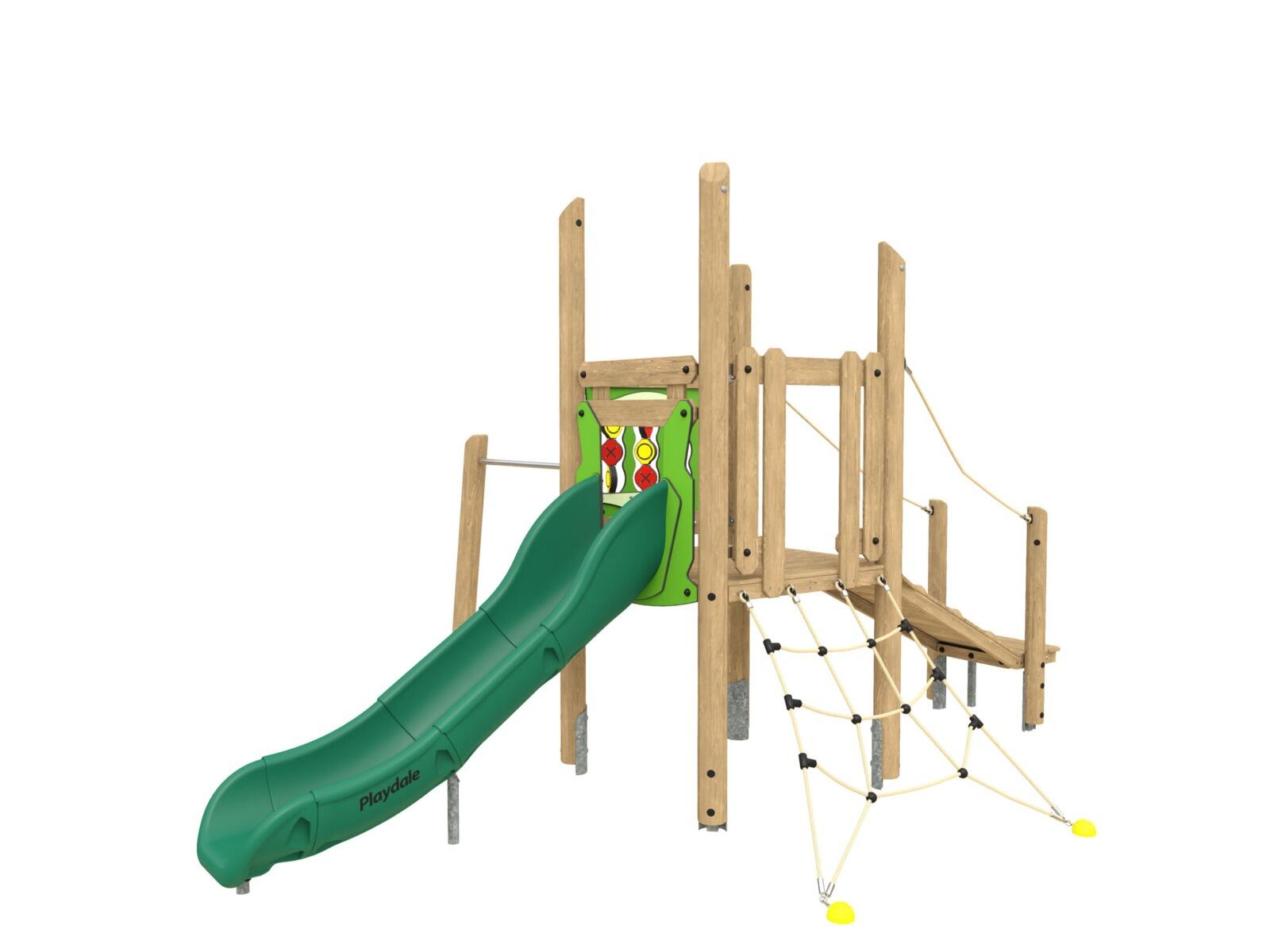 Et legemodul der stimulerer fantasien og inviterer til aktiv udeleg i harmoni med naturen. Det mindre klatretårn har stige, rutsjebane og brandmandsstang, som giver børnene trygge og varierede legeoplevelser. Det robuste jordfæste i stål holder limtræsstolperne hævet over jorden og beskytter mod fugt og slitage.