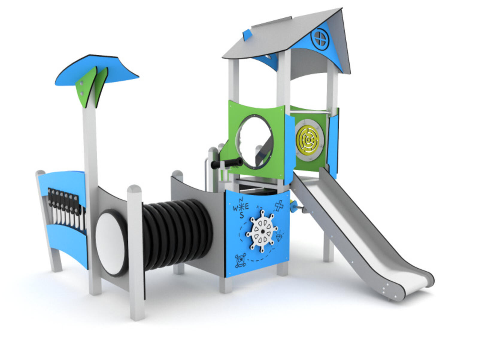 Piratskib med sandkasse, sandkran og bord. 2 platforme forbundet via tunnel. Trapper, legepaneler, klatrevæg og piratteleskop m.m. Rutsjebane i rustfrit stål med HDPE-sider. Materiale: pulvergalvaniseret og pulverlakeret stål. Platforme i HPL, paneler i multifarvet HDPE, stålreb flettet med polypropylen (sort). Forankring til nedstøbning medfølger. Ved installation skal den medfølgende manual altid følges. Den nyeste version kan rekvireres på forespørgsel.